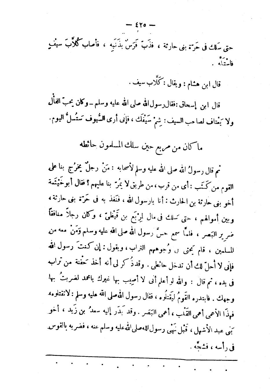 ثم قَالَ رَسُولُ اللهِ صَلَّى اللَّهُ عَلَيْهِ وَسَلَّمَ لِأَصْحَابِهِ: مَنْ رَجُلٌ يَخْرُجُ بِنَا عَلَى الْقَوْمِ مِنْ كَثَبٍ: أَيْ مِنْ قُرْبٍ، مِنْ طَرِيقٍ لَا يَمُرّ بِنَا عَلَيْهِمْ؟ فَقَالَ أَبُو خَيْثَمَةَ أَخُو بَنِي حَارِثَةَ بْنِ الْحَارِثِ: أَنَا يَا رَسُولَ اللهِ، فَنَفَذَ بِهِ فِي حَرّةِ بَنِي حَارِثَةَ، وَبَيْنَ أَمْوَالِهِمْ، حَتّى سَلَكَ فِي مَالٍ لِمِرْبَعِ بْنِ قَيْظِيّ، وَكَانَ رَجُلًا مُنَافِقًا ضَرِيرَ الْبَصَرِ، فَلَمّا سَمِعَ حِسّ رَسُولِ اللهِ صَلَّى اللَّهُ عَلَيْهِ وَسَلَّمَ وَمِنْ مَعَهُ مِنْ الْمُسْلِمِينَ، قَامَ يَحْثِي فِي وُجُوهِهِمْ التّرَابَ، وَيَقُولُ: إنْ كُنْتَ رَسُولَ اللهِ فَإِنّي لَا أُحِلّ لَك أَنْ تَدْخُلَ حَائِطِي. وَقَدْ ذُكِرَ لِي أَنّهُ أَخَذَ حَفْنَةً مِنْ تُرَابٍ فِي يَدِهِ، ثُمّ قَالَ: وَاَللهِ لَوْ أَعْلَمُ أَنّي لَا أُصِيبُ بِهَا غَيْرَك يَا مُحَمّدُ لَضَرَبْتُ بِهَا وَجْهَك. فَابْتَدَرَهُ الْقَوْمُ لِيَقْتُلُوهُ، فَقَالَ رَسُولُ اللهِ صَلَّى اللَّهُ عَلَيْهِ وَسَلَّمَ: لَا تَقْتُلُوهُ، فَهَذَا الْأَعْمَى أَعْمَى الْقَلْبِ، أَعْمَى الْبَصَرِ. وَقَدْ بَدَرَ إلَيْهِ سَعْدُ بْنُ زَيْدٍ، أَخُو بَنِي عَبْدِ الْأَشْهَلِ، قَبْلَ نَهَى رَسُولُ اللهِ صَلَّى اللَّهُ عَلَيْهِ وَسَلَّمَ عَنْهُ، فَضَرَبَهُ بِالْقَوْسِ فِي رَأْسِهِ، فشجّه.
