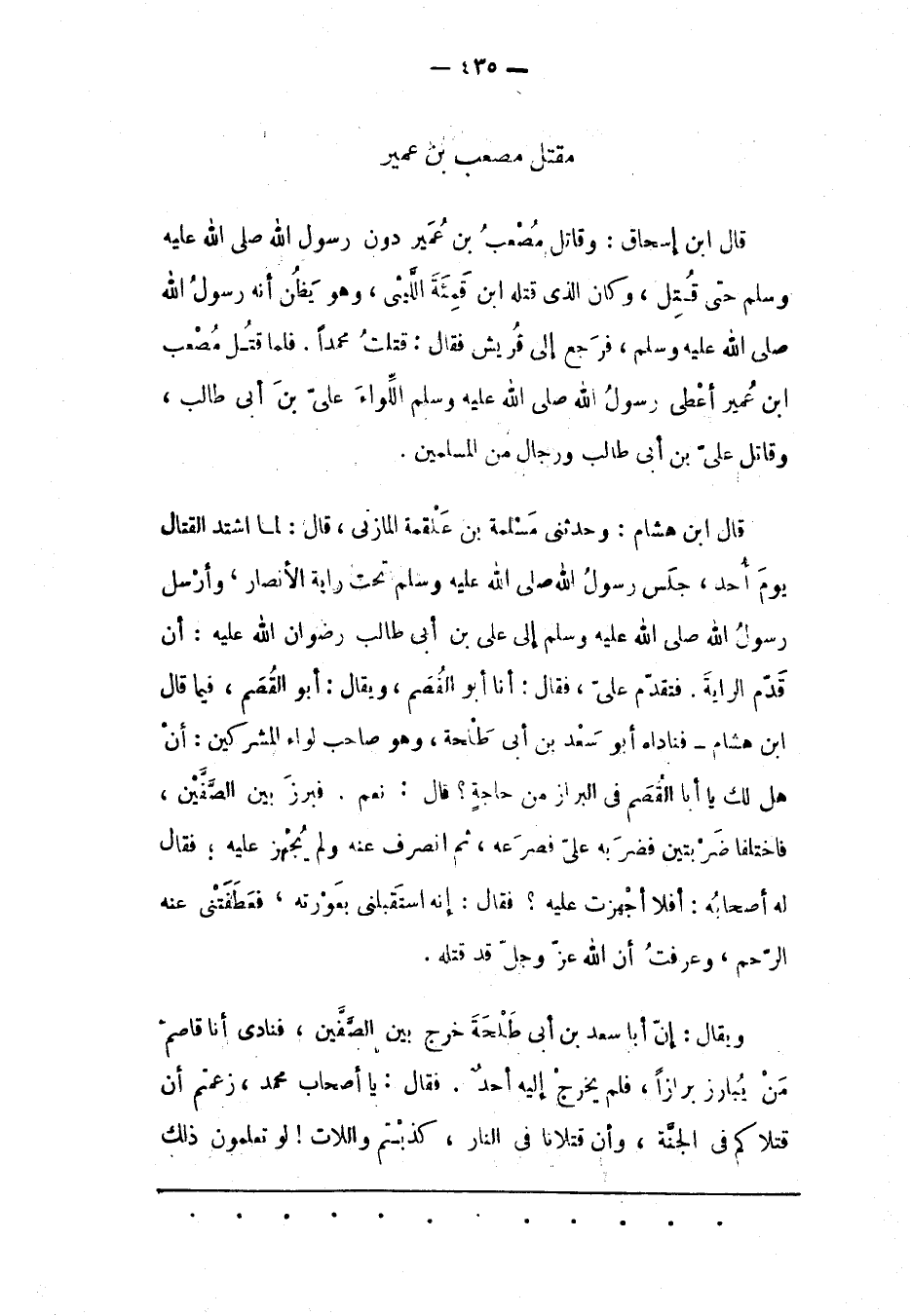 قَالَ ابْنُ هِشَامٍ: وَحَدّثَنِي مَسْلَمَةُ بْنُ عَلْقَمَةَ الْمَازِنِيّ، قَالَ: لَمّا اشْتَدّ الْقِتَالُ يَوْمَ أُحُدٍ، جلس رسول الله صلى الله عليه وسلم تَحْتَ رَايَةِ الْأَنْصَارِ، وَأَرْسَلَ رَسُولُ اللهِ صَلّى اللهُ عَلَيْهِ وَسَلّمَ إلَى عَلِيّ بْنِ أَبِي طَالِبٍ رِضْوَانُ اللهِ عَلَيْهِ: أَنْ قَدّمَ الرّايَة. فَتَقَدّمَ عَلِيّ، فَقَالَ: أَنَا أَبُو الْفُصَمِ، وَيُقَالُ: أَبُو الْقُصَمِ، فِيمَا قَالَ ابْنُ هِشَامٍ- فَنَادَاهُ أَبُو سَعْدِ بْنِ أَبِي طَلْحَةَ، وَهُوَ صَاحِبُ لِوَاءِ الْمُشْرِكِينَ: أَنْ هَلْ لَك يَا أَبَا الْقُصَمِ فِي الْبِرَازِ مِنْ حَاجَةٍ؟ قَالَ: نَعَمْ. فبرز بين الصّفّين، فاختلفا ضربتين فَضَرَبَهُ عَلِيّ فَصَرَعَهُ، ثُمّ انْصَرَفَ عَنْهُ وَلَمْ يُجْهَزْ عَلَيْهِ؛ فَقَالَ لَهُ أَصْحَابُهُ: أَفَلَا أُجْهِزْت عَلَيْهِ؟ فَقَالَ: إنّهُ اسْتَقْبَلَنِي بِعَوْرَتِهِ، فَعَطَفَتْنِي عَنْهُ الرّحِمُ، وَعَرَفْتُ أَنّ اللهَ عَزّ وَجَلّ قَدْ قَتَلَهُ.