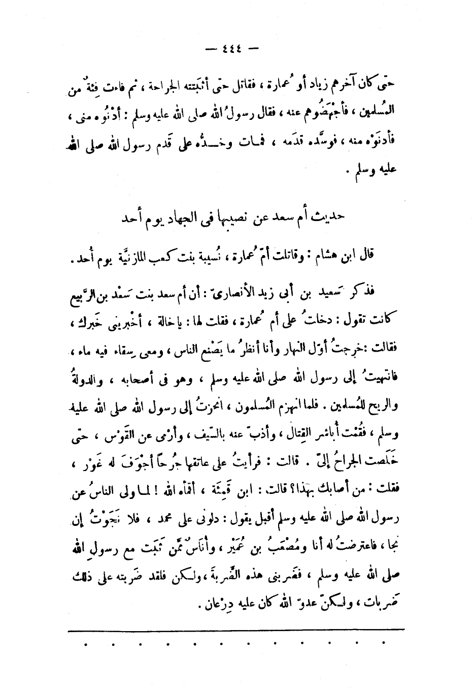 فَذَكَرَ سَعِيدُ بْنُ أَبِي زَيْدٍ الْأَنْصَارِيّ: أَنّ أُمّ سَعْدِ بِنْتِ سَعْدِ بْنِ الرّبِيعِ كَانَتْ تَقُولُ: دَخَلْتُ عَلَى أُمّ عُمَارَةَ، فَقُلْت لَهَا: يَا خَالَةُ، أَخْبِرِينِي خَبَرَك، فَقَالَتْ: خَرَجْتُ أَوّلَ النّهَارِ وَأَنَا أَنْظُرُ مَا يَصْنَعُ النّاسُ، وَمَعِي سِقَاءٌ فِيهِ مَاءٌ، فَانْتَهَيْتُ إلَى رَسُولِ اللهِ صَلَّى اللَّهُ عَلَيْهِ وَسَلَّمَ، وَهُوَ فِي أَصْحَابِهِ، وَالدّوْلَةُ وَالرّيحُ لِلْمُسْلِمِينَ. فَلَمّا انْهَزَمَ الْمُسْلِمُونَ، انْحَزْتُ إلَى رَسُولِ اللهِ صَلَّى اللَّهُ عَلَيْهِ وَسَلَّمَ، فَقُمْت أُبَاشِرُ الْقِتَالَ، وَأَذُبّ عَنْهُ بِالسّيْفِ، وَأَرْمِي عَنْ الْقَوْسِ، حَتّى خَلَصَتْ الْجِرَاحُ إلَيّ. قَالَتْ: فَرَأَيْتُ عَلَى عَاتِقِهَا جُرْحًا أَجْوَفَ لَهُ غَوْرٌ، فَقُلْت: مَنْ أَصَابَك بِهَذَا؟ قَالَتْ: ابْنُ قَمِئَةَ، أَقْمَأَهُ اللهُ! لَمّا وَلّى النّاسُ عَنْ رَسُولِ اللهِ صَلَّى اللَّهُ عَلَيْهِ وَسَلَّمَ أَقْبَلَ يَقُولُ: دُلّونِي عَلَى مُحَمّدٍ، فَلَا نَجَوْتُ إنْ نَجَا، فَاعْتَرَضْتُ لَهُ أَنَا وَمُصْعَبُ بْنُ عُمَيْرٍ، وَأُنَاسٌ مِمّنْ ثَبَتَ مَعَ رَسُولِ اللهِ صَلَّى اللَّهُ عَلَيْهِ وَسَلّمَ، فَضَرَبَنِي هَذِهِ الضّرْبَةَ، وَلَكِنْ فَلَقَدْ ضَرَبْته عَلَى ذَلِكَ ضَرْبَاتٍ، وَلَكِنّ عَدُوّ اللهِ كَانَ عَلَيْهِ دِرْعَانِ.
