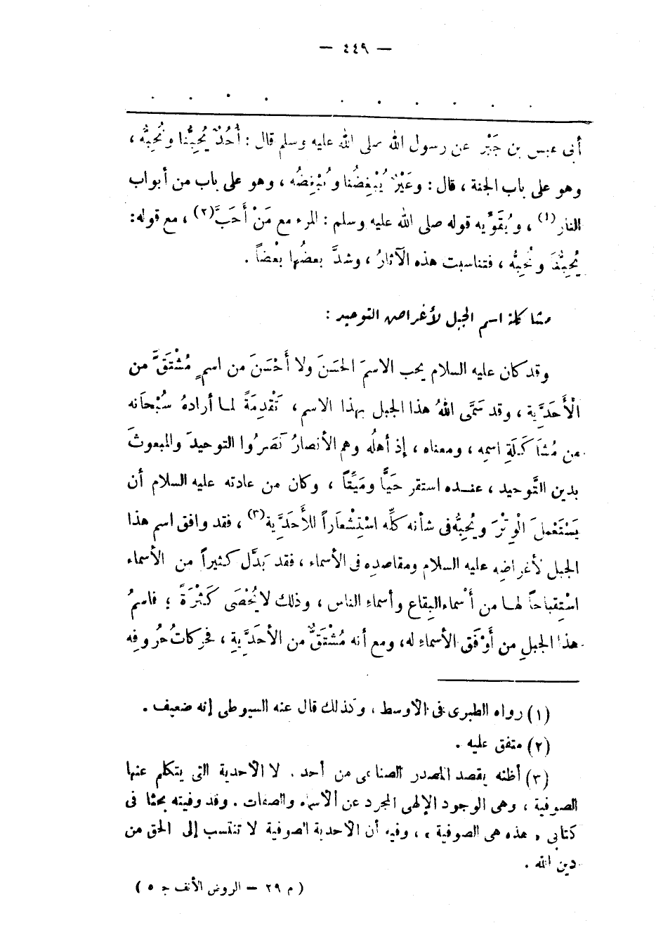 وَقَدْ كَانَ عَلَيْهِ السّلَامُ يُحِبّ الِاسْمَ الْحَسَنَ وَلَا أَحْسَنَ مِنْ اسْمٍ مُشْتَقّ مِنْ الْأَحَدِيّةِ، وَقَدْ سَمّى اللهُ هَذَا الْجَبَلَ بِهَذَا الِاسْمِ، تَقْدِمَةً لِمَا أَرَادَهُ سُبْحَانَهُ مِنْ مُشَاكَلَةِ اسْمِهِ، وَمَعْنَاهُ، إذْ أَهْلُهُ وَهُمْ الْأَنْصَارُ نَصَرُوا التّوْحِيدَ وَالْمَبْعُوثَ بِدِينِ التّوْحِيدِ، عِنْدَهُ اسْتَقَرّ حَيّا وَمَيّتًا، وَكَانَ مِنْ عَادَتِهِ عَلَيْهِ السّلَامُ أَنْ يَسْتَعْمِلَ الْوِتْرَ وَيُحِبّهُ فِي شَأْنِهِ كُلّهِ اسْتِشْعَارًا لِلْأَحَدِيّةِ «3» ، فَقَدْ وَافَقَ اسْمُ هَذَا الْجَبَلِ لِأَغْرَاضِهِ عَلَيْهِ السّلَامُ وَمَقَاصِدِهِ فِي الْأَسْمَاءِ، فَقَدْ بَدّلَ كَثِيرًا مِنْ الْأَسْمَاءِ اسْتِقْبَاحًا لَهَا مِنْ أَسْمَاءِ البقاع وأسماء الناس، وذلك لا يحصى كَثْرَةً؛ فَاسْمُ هَذَا الْجَبَلِ مِنْ أَوْفَقِ الْأَسْمَاءِ لَهُ، وَمَعَ أَنّهُ مُشْتَقّ مِنْ الْأَحَدِيّةِ، فَحَرَكَاتُ حروفه