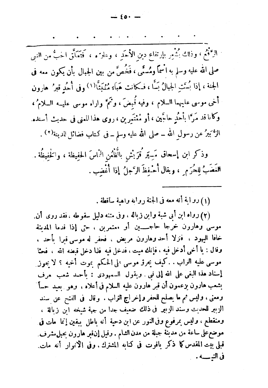 (2) رواه ابن أبى شبة وابن زباله، وفى متنه دليل سقوطه، فقد روى أن موسى وهارون خرجا حاجين أو معتمرين، حتى إذا قدما المدينة خافا اليهود، فنزلا أحد وهارون مريض، فحفر له موسى قبرا بأحد، وقال: يا أخى أدخل فيه، فإنك ميت، فدخل فيه فلما دخل قبضه الله، فحثا موسى عليه التراب.. كيف يحرؤ موسى على الحكم بموت أخيه؟ لا يجوز إسناد هذا البغى على الله إلى نبى. ويقول السمهودى: بأحد شعب تعرف بشعب هارون يزعمون أن قبر هارون عليه السلام فى أعلاه، وهو بعيد حسا ومعنى، وليس ثم ما يصلح للحفر وإخراج التراب. وقال فى الفتح عن سند الزبير للحديث وسند الزبير فى ذلك ضعيف جدا من جهة شيخه ابن زبالة، ومنقطع، وليس بمرفوع وفى النور عن ابن دحية أنه باطل ببقين إنما مات فى موضع على ساعة من مدينة جبلة من مدن الشام. وقيل إن قبر هارون بحبل مشرف قبلى بيت المقدس كما ذكر ياقوت فى كتابه المشترك، وفى الأنوار أنه مات فى التيه.