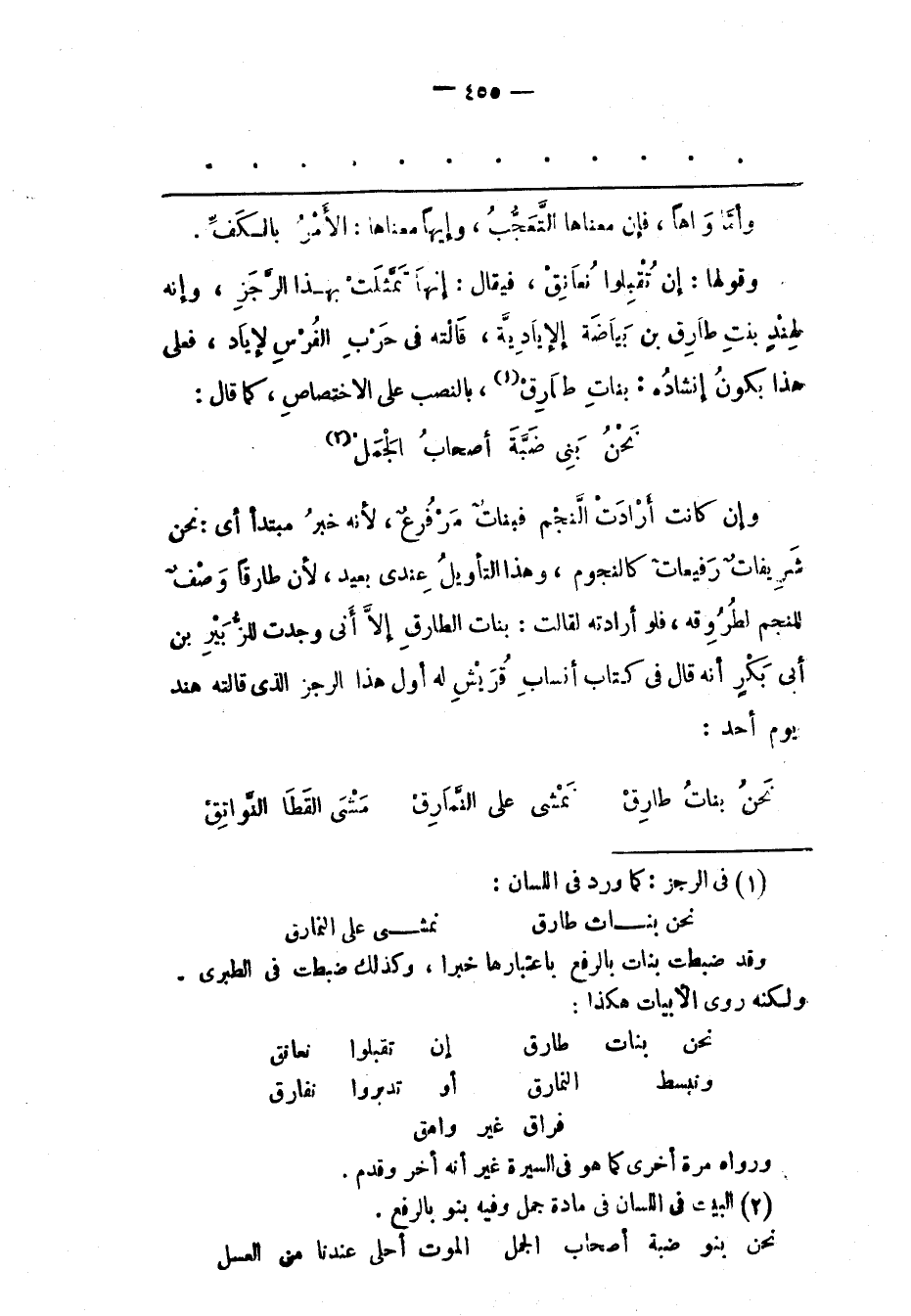 نَحْنُ بَنِي ضَبّةَ أَصْحَابُ الْجَمَلْ «2» وَإِنْ كَانَتْ أرادت الّنجم فبنات مرفرع، لِأَنّهُ خَبَرُ مُبْتَدَأٍ أَيْ: نَحْنُ شَرِيفَاتٌ رَفِيعَاتٌ كَالنّجُومِ، وَهَذَا التّأْوِيلُ عِنْدِي بَعِيدٌ، لِأَنّ طَارِقًا وَصْفٌ لِلنّجْمِ لِطُرُوقِهِ، فَلَوْ أَرَادَتْهُ لَقَالَتْ: بَنَاتُ الطّارِقِ إلّا أَنّي وَجَدْت لِلزّبَيْرِ بْنِ أَبِي بَكْرٍ أَنّهُ قَالَ فِي كِتَابِ أَنْسَابِ قُرَيْشٍ له أول هذا الرجز الذى قالته هند يَوْمِ أُحُدٍ: