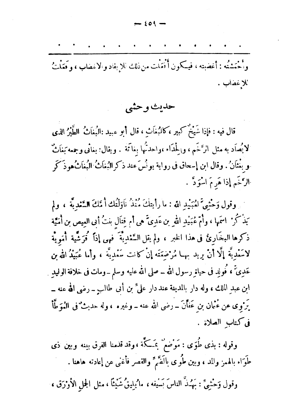 وَقَوْلُ وَحْشِيّ لِعُبَيْدِ اللهِ: مَا رَأَيْتُك مُنْذُ نَاوَلْتُك أُمّك السّعْدِيّةَ، وَلَمْ يَذْكُرْ اسْمَهَا، وَأُمّ عُبَيْدِ اللهِ بْنِ عَدِيّ هِيَ أُمّ قِتَالٍ بِنْتُ أَبِي الْعِيصِ بْنِ أُمَيّةَ ذَكَرَهَا الْبُخَارِيّ فِي هَذَا الْخَبَرِ، وَلَمْ يَقُلْ السّعْدِيّةُ فَهِيَ إذًا قُرَشِيّةٌ أُمَوِيّةٌ لَا سَعْدِيّةٌ إلّا أَنْ يُرِيدَ بِهَا مُرْضِعَتَهُ إنْ كَانَتْ سَعْدِيّةً، وَأَمّا عُبَيْدُ اللهِ بْنُ عَدِيّ، فَوُلِدَ فِي حَيَاةِ رَسُولِ اللهِ- صَلَّى اللَّهُ عَلَيْهِ وَسَلَّمَ- وَمَاتَ فِي خِلَافَةِ الْوَلِيدِ ابن عَبْدِ الْمَلِكِ، وَلَهُ دَارٌ بِالْمَدِينَةِ عِنْدَ دَارِ علي بن أبي طالب- رضي الله عنه- يُرْوَى عَنْ عُثْمَانَ بْنِ عَفّانَ- رَضِيَ اللهُ عَنْهُ- وَغَيْرِهِ، وَلَهُ حَدِيثٌ فِي الْمُوَطّأِ فِي كِتَابِ الصّلَاةِ.