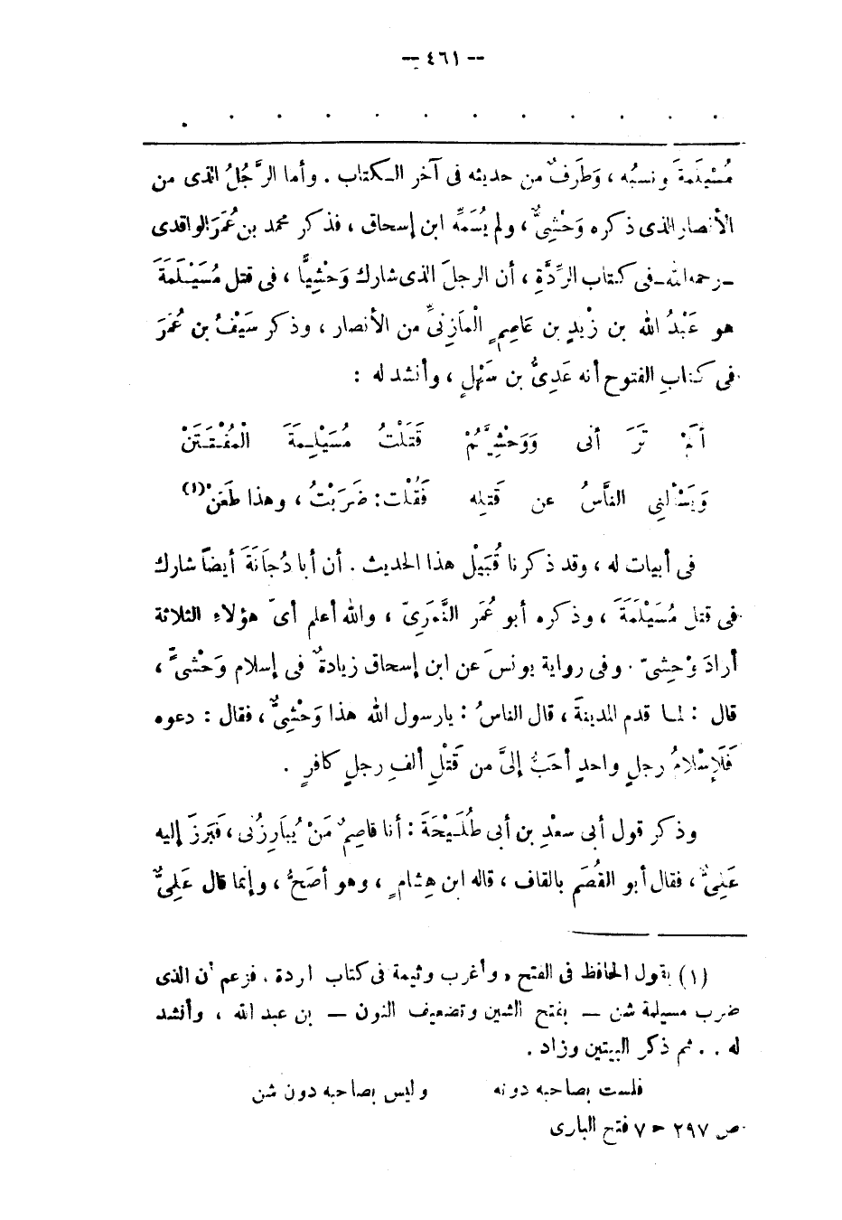 (1) تقول الحافظ فى الفتح «وأغرب وثيمة فى كتاب اردة، فزعم أن الذى ضرب مسيلمة شن- بفتح الشين وتضعيف النون- بن عبد الله، وأنشد له.. ثم ذكر البيتين وزاد.