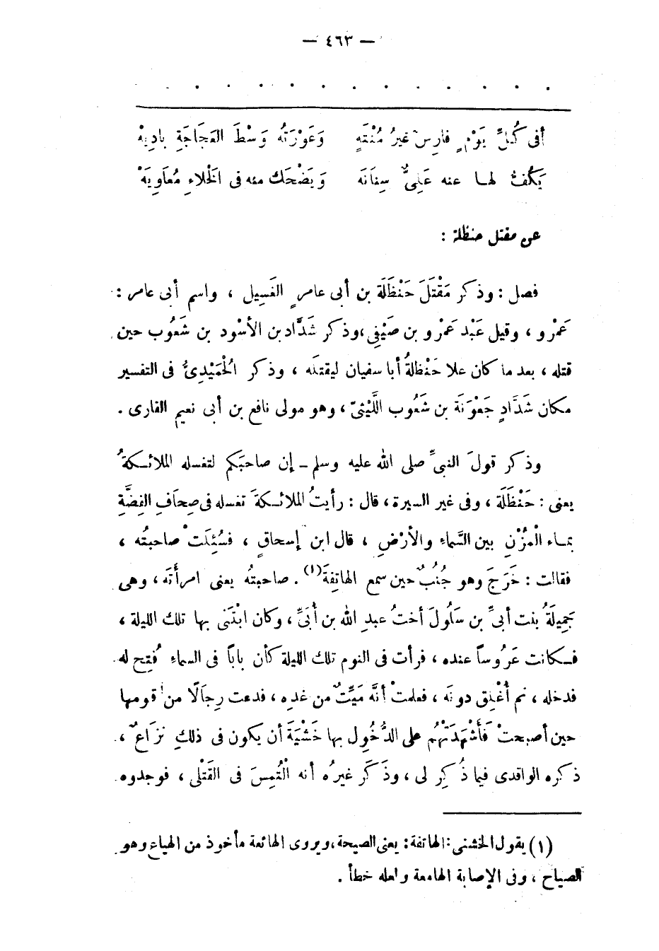 عَنْ مَقْتَلِ حَنْظَلَةَ: فَصْلٌ: وَذَكَرَ مَقْتَلَ حَنْظَلَةَ بْنِ أَبِي عَامِرٍ الْغَسِيلِ، وَاسْمَ أَبِي عَامِرٍ: