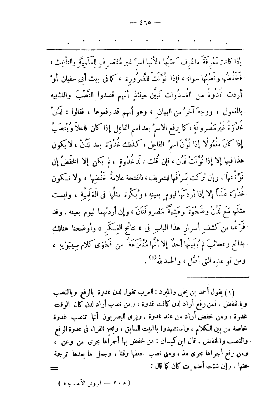 إذَا كَانَتْ مَعْرِفَةً مَا عُرِفَ نَصْبُهَا، لِأَنّهَا اسْمٌ غَيْرُ مُنْصَرِفٍ لِلْعَلَمِيّةِ وَالتّأْنِيثِ، فَخَفْضُهَا وَنَصْبُهَا سَوَاءٌ، فَإِذَا نُوّنَتْ لِلضّرُورَةِ، كَمَا فِي بَيْتِ أَبِي سُفْيَانَ أَوْ أَرَدْت غُدْوَةً مِنْ الْغَدَوَاتِ تَبَيّنَ حِينَئِذٍ أَنّهُمْ قَصَدُوا النّصْبَ وَالتّشْبِيهَ بِالْمَفْعُولِ، وَوَجْهٌ آخَرُ مِنْ الْبَيَانِ، وَهُوَ أَنّهُمْ قَدْ رَفَعُوهَا، فَقَالُوا: لَدُنْ غُدْوَةُ غَيْرُ مَصْرُوفَةٍ، كَمَا يُرْفَعُ الِاسْمُ بَعْدَ اسْمِ الْفَاعِلِ إذا كَانَ فَاعِلًا وَيُنْصَبُ إذَا كَانَ مَفْعُولًا إذَا نُوّنَ اسْمُ الْفَاعِلِ، كَذَلِكَ غُدْوَةٌ بَعْد لَدُنْ، لَا يَكُونُ هَذَا فِيهَا إلّا إذَا نُوّنَتْ لَدُنْ، فإن قلت: لدغدوة، لَمْ يَكُنْ إلّا الْخَفْضُ إنْ نَوّنْتهَا، وَإِنْ تَرَكْت صَرْفَهَا لِلتّعْرِيفِ، فَالْفَتْحَةُ عَلَامَةُ خَفْضِهَا، وَلَا تَكُونُ غَدْوَةٌ عَلَمًا إلّا إذَا أَرَدْتهَا لِيَوْمِ بِعَيْنِهِ، وَبُكْرَةٌ مِثْلُهَا فِي الْعَلَمِيّةِ، وَلَيْسَتْ مِثْلَهَا مع لدن وضحوة وَعَشِيّةٍ مَصْرُوفَتَانِ، وَإِنْ أَرَدْتهمَا لِيَوْمِ بِعَيْنِهِ. وَقَدْ فَرَغْنَا مِنْ كَشْفِ أَسْرَارِ هَذَا الْبَابِ فِي «نَتَائِجِ الْفِكْرِ» وَأَوْضَحْنَا هُنَالِكَ بَدَائِعَ وَعَجَائِبَ لَمْ يُبَيّنْهَا أَحَدٌ إلّا أَنّهَا مُنْتَزِعَةٌ مِنْ فَحَوَى كَلَامِ سِيبَوَيْهِ، وَمِنْ قَوَاعِدِهِ الّتِي أَصْلٌ، وَالْحَمْدُ لله «1» .