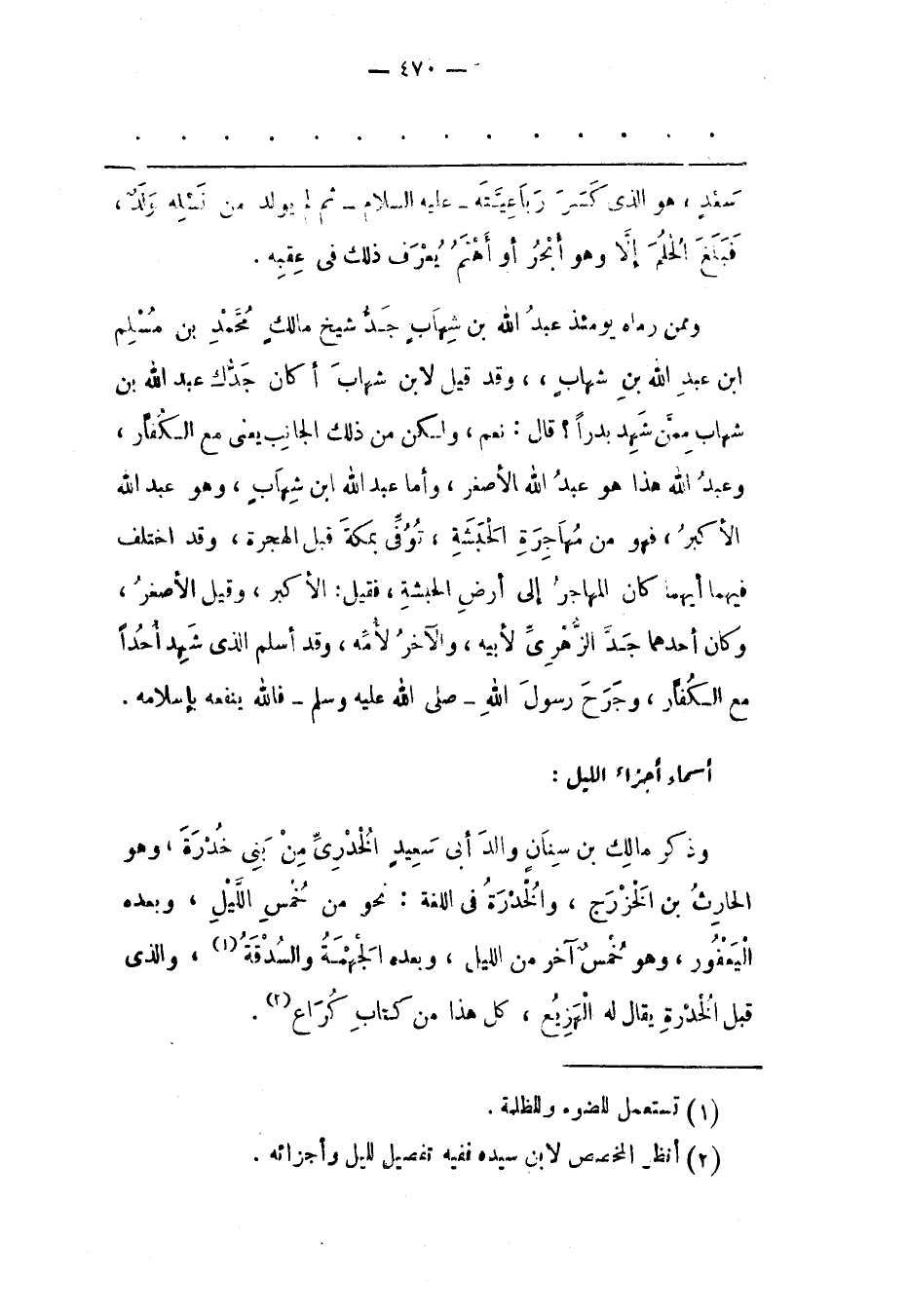أَسْمَاءُ أَجْزَاءِ اللّيْلِ: وَذَكَرَ مَالِكَ بْنَ سِنَانٍ وَالِدَ أَبِي سَعِيدٍ الْخُدْرِيّ مِنْ بَنِي خُدْرَةَ، وَهُوَ الْحَارِثُ بْنُ الْخَزْرَجِ، وَالْخُدْرَةُ فِي اللّغَةِ: نَحْوٌ مِنْ خُمْسِ اللّيْلِ، وَبَعْدَهُ الْيَعْفُورُ، وَهُوَ خُمْسٌ آخَرُ مِنْ اللّيْلِ، وَبَعْدَهُ الْجَهْمَةُ وَالسّدْقَةُ «1» ، وَاَلّذِي قَبْلَ الْخُدْرَةِ يُقَالُ لَهُ الْهَزِيعُ، كل هذا من كتاب كراع «2» .
