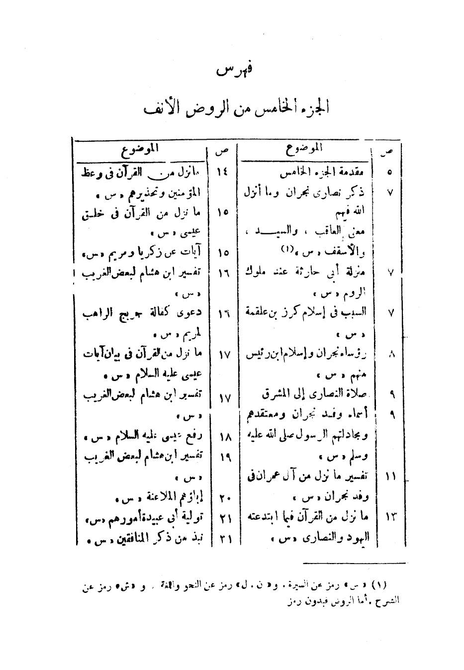 (1) «س» رمز عن السيرة. و «ن. ل» رمز عن النحو واللغة. و «ش» رمز عن الشرح. أما الروض فبدون رمز