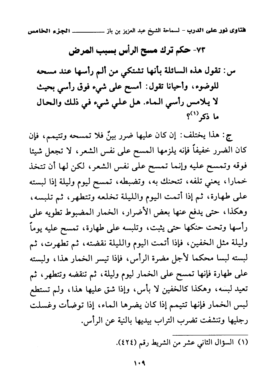 س: تقول هذه السائلة بأنها تشتكي من ألم رأسها عند مسحه للوضوء، وأحيانا تقول: أمسح على شيء فوق رأسي بحيث لا يلامس رأسي الماء، هل علي شيء في ذلك والحال ما ذكر؟ (¬1)