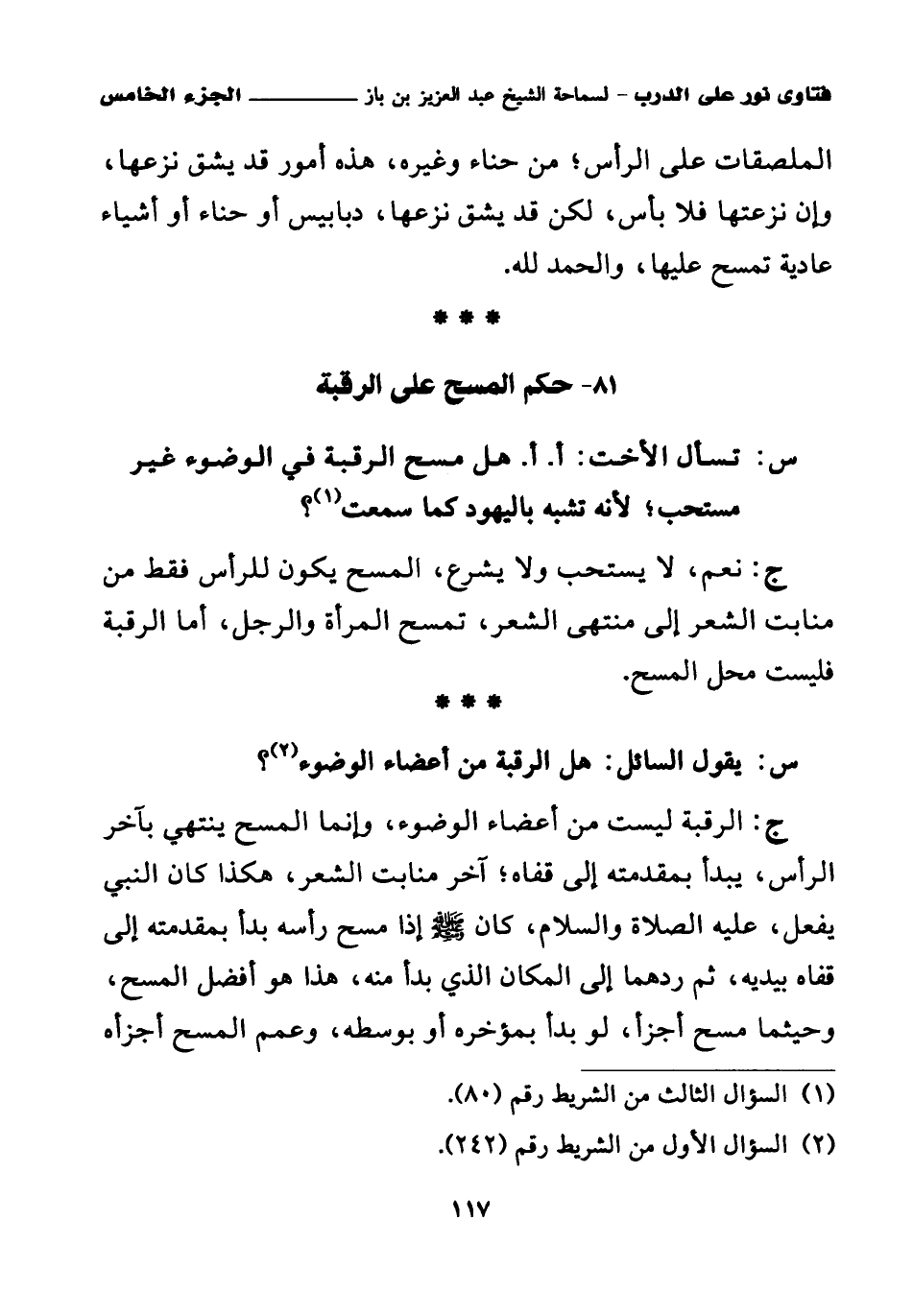 س: تسأل الأخت أ. أ. هل مسح الرقبة في الوضوء غير مستحب؛ لأنه تشبه باليهود كما سمعت؟ (¬1)