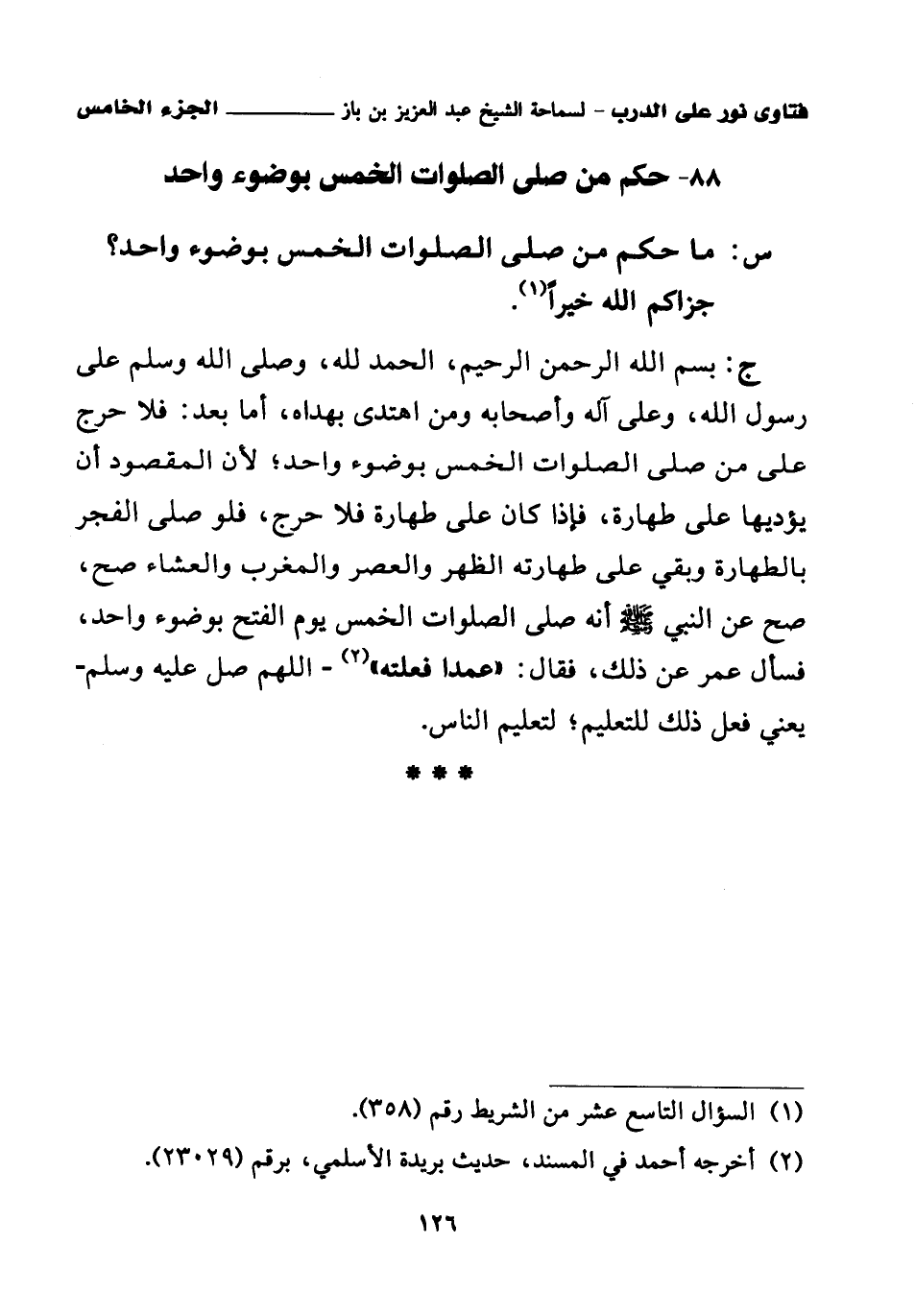 ج: بسم الله الرحمن الرحيم، الحمد لله، وصلى الله وسلم على رسول الله، وعلى آله وأصحابه ومن اهتدى بهداه، أما بعد: فلا حرج على من صلى الصلوات الخمس بوضوء واحد؛ لأن المقصود أن يؤديها على طهارة، فإذا كان على طهارة فلا حرج، فلو صلى الفجر بالطهارة وبقي على طهارته الظهر والعصر والمغرب والعشاء صح، صح عن النبي صلى الله عليه وسلم أنه «صلى الصلوات الخمس يوم الفتح بوضوء واحد، فسأل عمر عن ذلك، فقال: عمدا فعلته (¬2)» – اللهم صل عليه وسلم – يعني فعل ذلك للتعليم؛ لتعليم الناس.