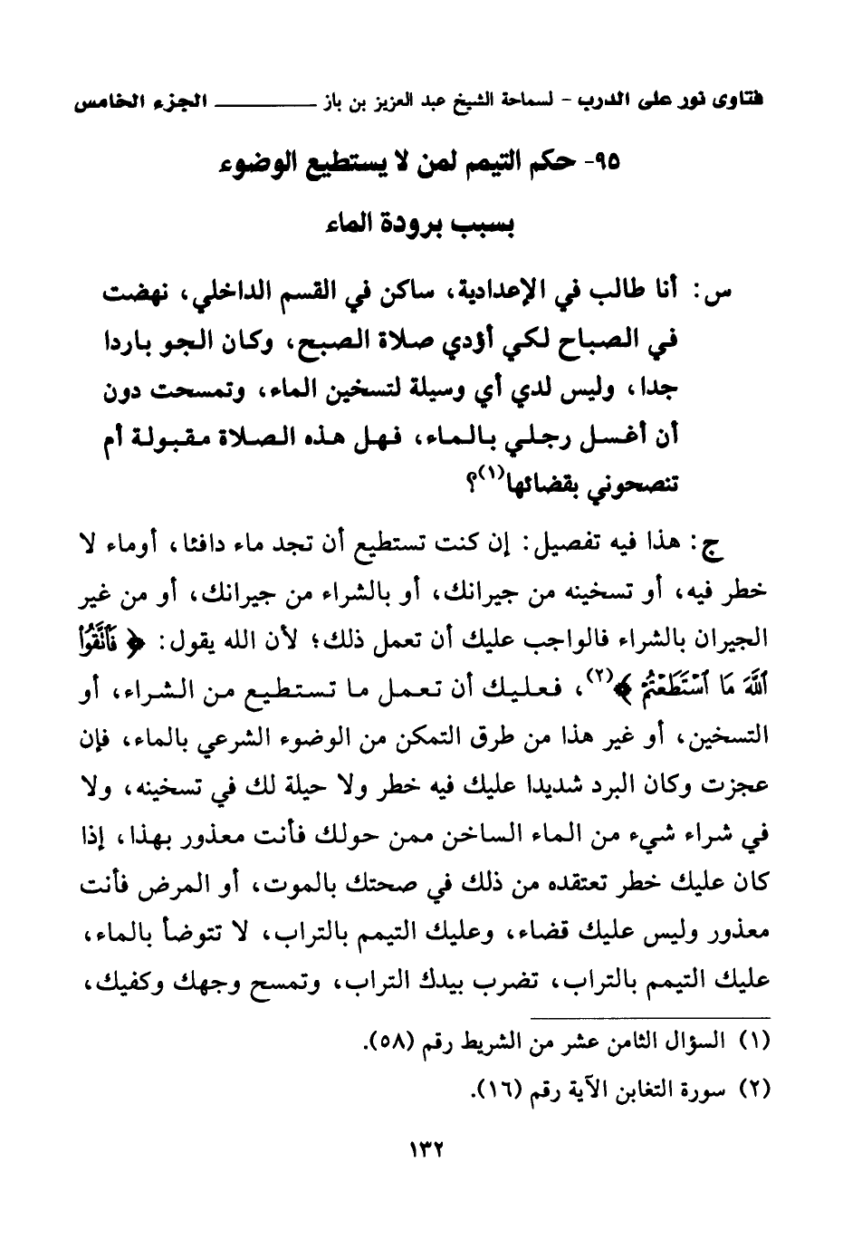 ج: هذا فيه تفصيل: إن كنت تستطيع أن تجد ماء دافئا، أو ماء لا خطر فيه، أو تسخينه من جيرانك، أو بالشراء من جيرانك، أو من غير الجيران بالشراء فالواجب عليك أن تعمل ذلك؛ لأن الله يقول: {فَاتَّقُوا اللَّهَ مَا اسْتَطَعْتُمْ} (¬2)، فعليك أن تعمل ما تستطيع من الشراء، أو التسخين، أو غير هذا من طرق التمكن من الوضوء الشرعي بالماء، فإن عجزت وكان البرد شديدا عليك فيه خطر ولا حيلة لك في تسخينه، ولا في شراء شيء من الماء الساخن ممن حولك فأنت معذور بهذا، إذا كان عليك خطر تعتقده من ذلك في صحتك بالموت، أو المرض فأنت معذور وليس عليك قضاء، وعليك التيمم بالتراب، لا تتوضأ بالماء عليك التيمم بالتراب، تضرب بيدك التراب، وتمسح وجهك وكفيك،