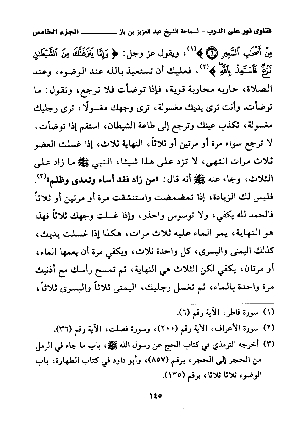 ، ويقول عز وجل: {وَإِمَّا يَنْزَغَنَّكَ مِنَ الشَّيْطَانِ نَزْغٌ فَاسْتَعِذْ بِاللَّهِ} (¬1)، فعليك أن تستعيذ بالله عند الوضوء، وعند الصلاة، حاربه محاربة قوية، فإذا توضأت فلا ترجع، وتقول: ما توضأت وأنت ترى يديك مغسولة، ترى وجهك مغسولا، ترى رجليك مغسولة، تكذب عينك وترجع إلى طاعة الشيطان، استقم إذا توضأت، لا ترجع سواء مرة أو مرتين أو ثلاثا، النهاية ثلاث، إذا غسلت العضو ثلاث مرات انتهى، لا تزد على هذا شيئا، النبي صلى الله عليه وسلم ما زاد على الثلاث، وجاء عنه صلى الله عليه وسلم أنه قال: «من زاد فقد أساء وتعدى وظلم (¬2)» فليس لك الزيادة، إذا تمضمضت واستنشقت مرة أو مرتين أو ثلاثا فالحمد لله يكفي، ولا توسوس واحذر وإذا غسلت وجهك ثلاثا فهذا هو النهاية، يمر الماء عليه ثلاث مرات هكذا إذا غسلت يديك كذلك اليمني واليسرى كل واحدة ثلاث ويكفي مرة أن يعمها الماء أو مرتان، يكفي لكن الثلاث هي النهاية، ثم تمسح رأسك مع أذنيك مرة واحدة بالماء ثم تغسل رجليك اليمني ثلاث واليسرى ثلاث