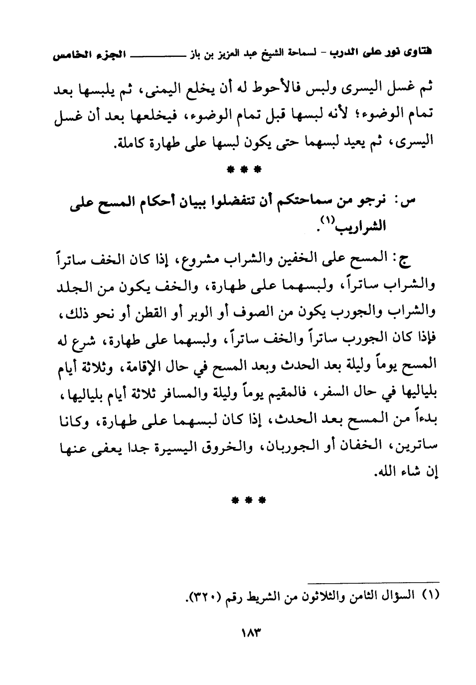 س: نرجو من سماحتكم أن تتفضلوا ببيان أحكام المسح على الشراريب؟ (¬1)