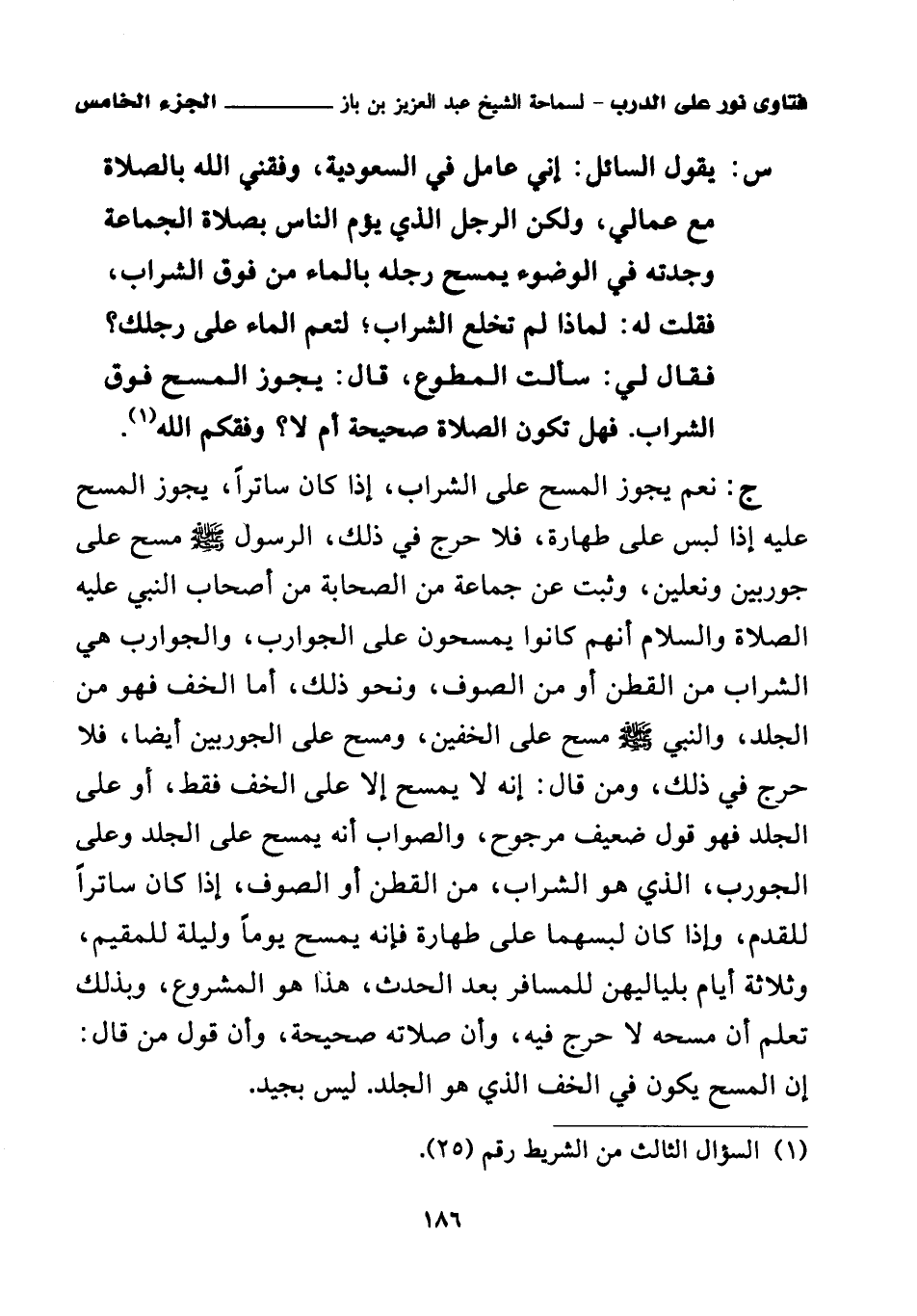 س: يقول السائل: إني عامل في السعودية، وفقني الله بالصلاة مع عمالي، ولكن الرجل الذي يؤم الناس بصلاة الجماعة وجدته في الوضوء يمسح رجله بالماء من فوق الشراب، فقلت له: لماذا لم تخلع الشراب؛ لتعم الماء على رجلك؟ فقال لي: سألت المطوع، قال: يجوز المسح فوق الشراب، فهل تكون الصلاة صحيحة أم لا؟ وفقكم الله (¬1)