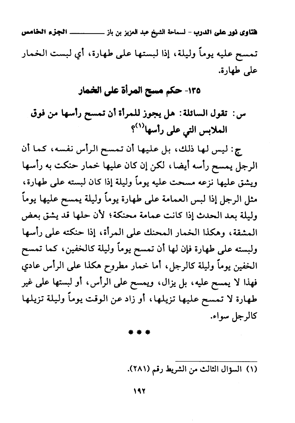 ج: ليس لها ذلك، بل عليها أن تمسح الرأس نفسه، كما أن الرجل يمسح رأسه أيضا، لكن إن كان عليها خمار حنكت به رأسها ويشق عليها نزعه مسحت عليه يوما وليلة إذا كان لبسته على طهارة، مثل الرجل إذا لبس العمامة على طهارة يوما وليلة يمسح عليها يوما وليلة بعد الحدث إذا كانت عمامة محنكة؛ لأن حلها قد يشق بعض المشقة، وهكذا الخمار المحنك على المرأة، إذا حنكته على رأسها ولبسته على طهارة فإن لها أن تمسح يوما وليلة كالخفين، كما تمسح الخفين يوما وليلة كالرجل، أما خمار مطروح هكذا على الرأس عادي فهذا لا يمسح عليه، بل يزال، ويمسح على الرأس، أو لبستها على غير طهارة لا تمسح عليها تزيلها، أو زاد عن الوقت يوما وليلة تزيلها كالرجل سواء.