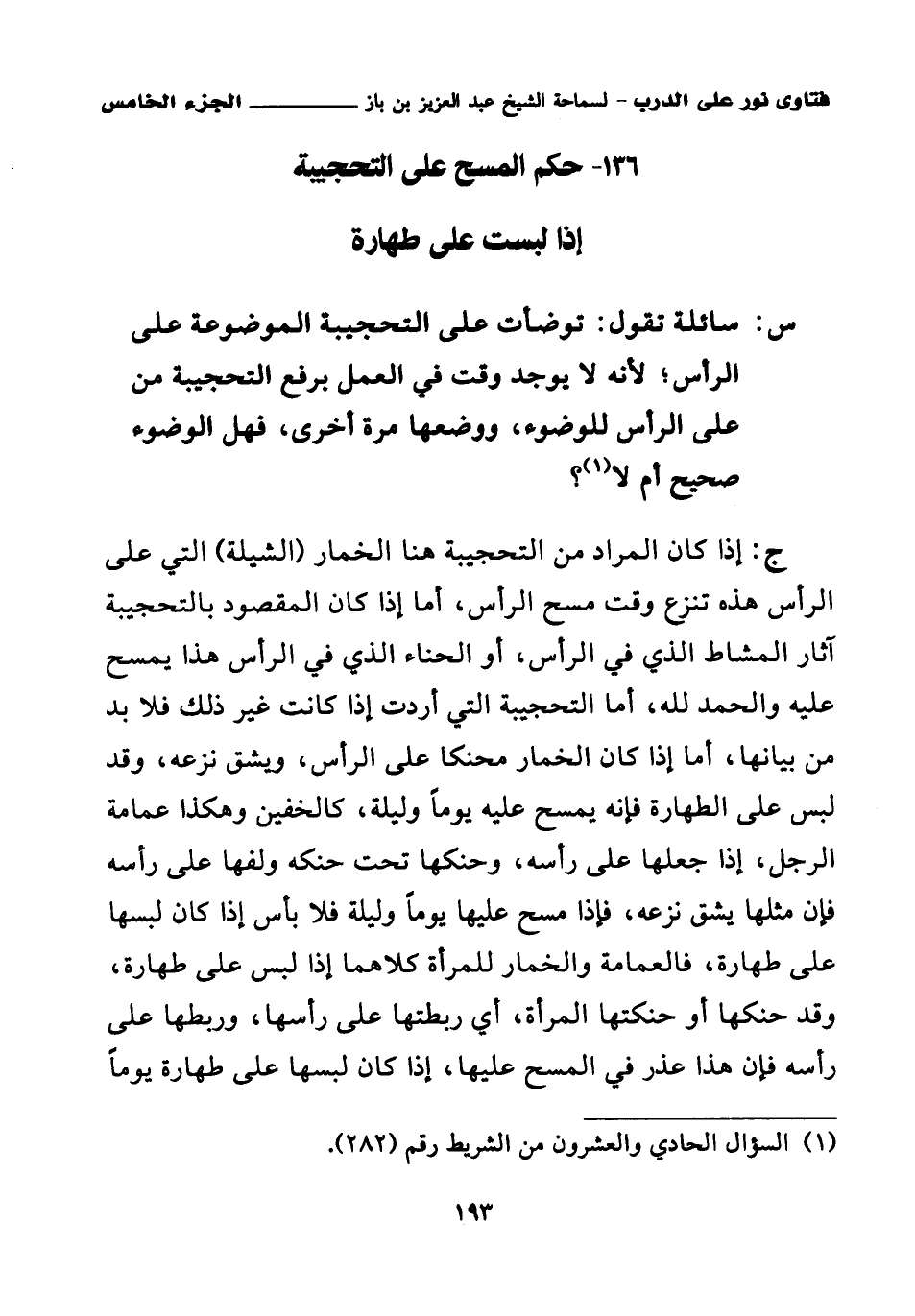 ج: إذا كان المراد من التحجيبة هنا الخمار (الشيلة) التي على الرأس هذه تنزع وقت مسح الرأس، أما إذا كان المقصود بالتحجيبة آثار المشاط الذي في الرأس، أو الحناء الذي في الرأس هذا يمسح عليه والحمد لله، أما التحجيبة التي أردت إذا كانت غير ذلك فلا بد من بيانها، أما إذا كان الخمار محنكا على الرأس، ويشق نزعه، وقد لبس على الطهارة فإنه يمسح عليه يوما وليلة، كالخفين وهكذا عمامة الرجل، إذا جعلها على رأسه، وحنكها تحت حنكه ولفها على رأسه فإن مثلها يشق نزعه، فإذا مسح عليها يوما وليلة فلا بأس إذا كان لبسها على طهارة، فالعمامة والخمار للمرأة كلاهما إذا لبس على طهارة، وقد حنكها أو حنكتها المرأة، أي ربطتها على رأسها، وربطها على رأسه فإن هذا عذر في المسح عليها، إذا كان لبسها على طهارة يوما