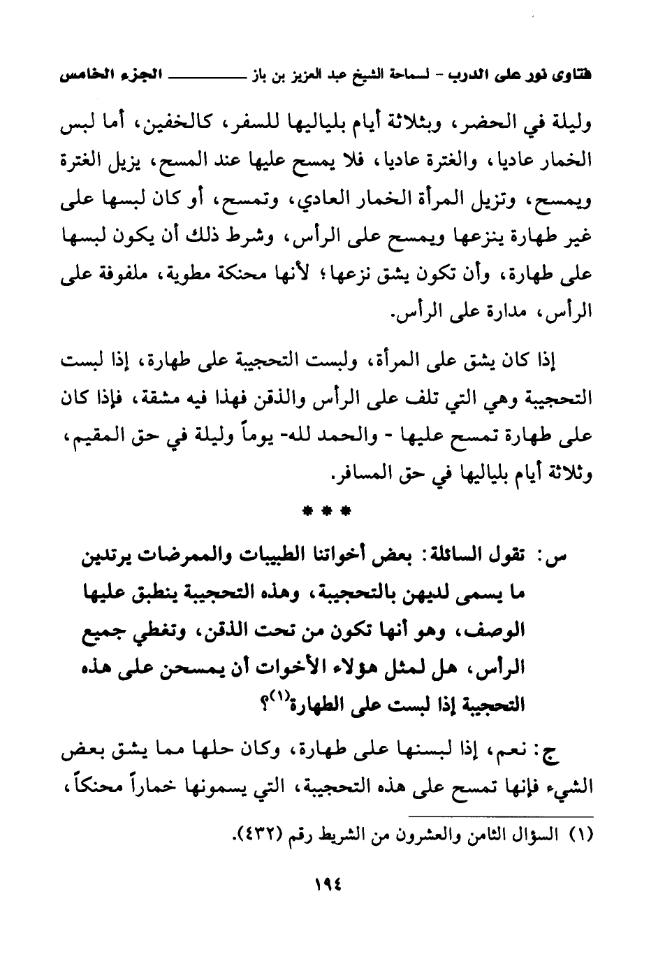س: تقول السائلة: بعض أخواتنا الطبيبات والممرضات يرتدين ما يسمى لديهن بالتحجيبة، وهذه التحجيبة ينطبق عليها الوصف، وهو أنها تكون من تحت الذقن، وتغطي جميع الرأس، هل لمثل هؤلاء الأخوات أن يمسحن على هذه التحجيبة إذا لبست على الطهارة؟ (¬1)