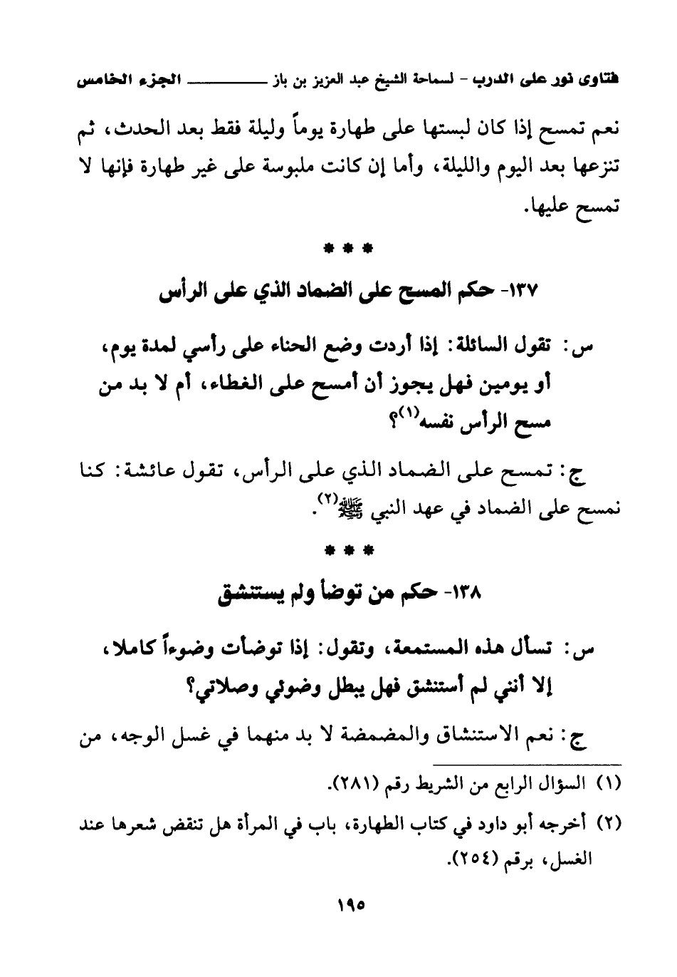 ج: تمسح على الضماد الذي على الرأس، تقول عائشة: «كنا نمسح على الضماد في عهد النبي صلى الله عليه وسلم (¬2)».