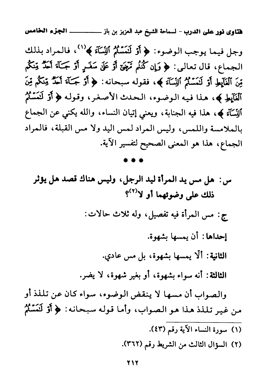 وجل فيما يوجب الوضوء: {أَوْ لَامَسْتُمُ النِّسَاءَ} (¬1) النساء، فالمراد بذلك الجماع، قال تعالى: {وَإِنْ كُنْتُمْ مَرْضَى أَوْ عَلَى سَفَرٍ أَوْ جَاءَ أَحَدٌ مِنْكُمْ مِنَ الْغَائِطِ أَوْ لَامَسْتُمُ النِّسَاءَ} (¬2)، فقوله سبحانه: {أَوْ جَاءَ أَحَدٌ مِنْكُمْ مِنَ الْغَائِطِ} (¬3)، هذا فيه الوضوء الحدث الأصغر وقوله {أَوْ لَامَسْتُمُ النِّسَاءَ} (¬4) النساء هذا فيه الجنابة، ويعني إتيان النساء، والله يكني عن الجماع بالملامسة واللمس، وليس المراد لمس اليد ولا مس القبلة، فالمراد الجماع، هذا هو المعنى الصحيح لتفسير الآية.