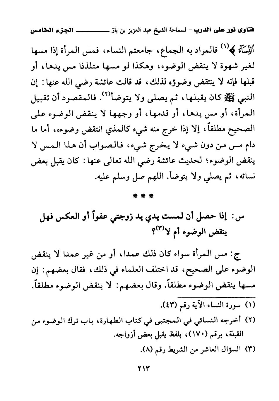 ، فالمراد به الجماع، جامعتم النساء، فمس المرأة إذا مسها لغير شهوة لا ينقض الوضوء، وهكذا لو مسها متلذذا مس يدها، أو قبلها فإنه لا ينتقض وضوؤه لذلك، قد قالت عائشة رضي الله عنها: «إن النبي صلى الله عليه وسلم كان يقبلها، ثم يصلي ولا يتوضأ (¬1)» فالمقصود أن تقبيل المرأة، أو مس يدها، أو قدمها، أو وجهها لا ينقض الوضوء على الصحيح مطلقا، إلا إذا خرج منه شيء كالمذي انتقض وضوءه، أما ما دام مس من دون شيء لا يخرج شيء، فالصواب أن هذا المس لا ينقض الوضوء؛ لحديث عائشة رضي الله تعالى عنها: «كان يقبل بعض نسائه، ثم يصلي ولا يتوضأ (¬2)».