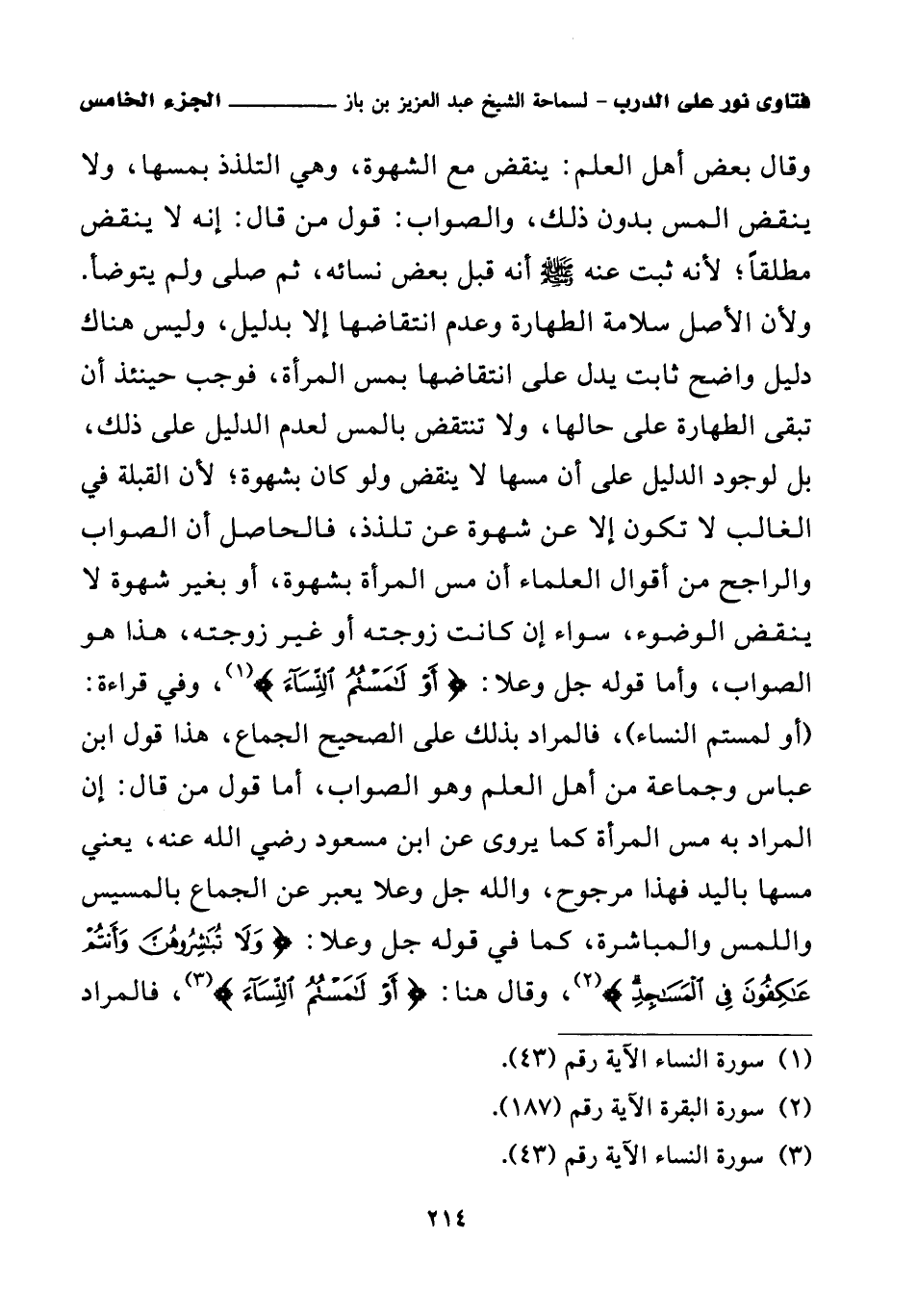 ولأن الأصل سلامة الطهارة وعدم انتقاضها إلا بدليل، وليس هناك دليل واضح ثابت يدل على انتقاضها بمس المرأة، فوجب حينئذ أن تبقى الطهارة على حالها، ولا تنتقض بالمس لعدم الدليل على ذلك، بل لوجود الدليل على أن مسها لا ينقض ولو كان بشهوة؛ لأن القبلة في الغالب لا تكون إلا عن شهوة عن تلذذ، فالحاصل أن الصواب والراجح من أقوال العلماء أن مس المرأة بشهوة، أو بغير شهوة لا ينقض الوضوء، سواء إن كانت زوجته أو غير زوجته، هذا هو الصواب، وأما قوله جل وعلا: {أَوْ لَامَسْتُمُ النِّسَاءَ} (¬1)، وفي قراءة: (أو لمستم النساء)، فالمراد بذلك على الصحيح الجماع، هذا قول ابن عباس وجماعة من أهل العلم وهو الصواب، أما قول من قال: إن المراد به مس المرأة كما يروي عن ابن مسعود رضي الله عنه، يعني مسها باليد فهذا مرجوح، والله جل وعلا يعبر عن الجماع بالمسيس واللمس والمباشرة، كما في قوله جل وعلا: {وَلَا تُبَاشِرُوهُنَّ وَأَنْتُمْ عَاكِفُونَ فِي الْمَسَاجِدِ} (¬2)، وقال هنا: {أَوْ لَامَسْتُمُ النِّسَاءَ} (¬3)، فالمراد