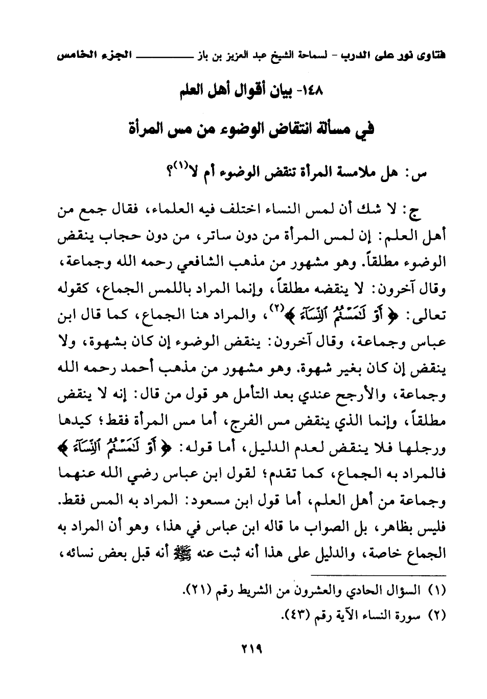 148 - بيان أقوال أهل العلم في مسألة انتقاض الوضوء من مس المرأة