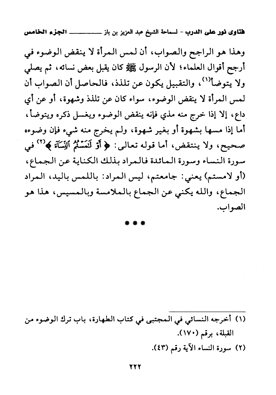 وهذا هو الراجح والصواب، أن لمس المرأة لا ينقض الوضوء في أرجح أقوال العلماء؛ لأن الرسول صلى الله عليه وسلم «كان يقبل بعض نسائه، ثم يصلي ولا يتوضأ (¬1)» والتقبيل يكون عن تلذذ فالحاصل أن الصواب أن لمس المرأة لا ينقض الوضوء، سواء كان عن تلذذ وشهوة، أو عن أي داع، إلا إذا خرج منه مذي فإنه ينقض الوضوء ويغسل ذكره ويتوضأ، أما إذا مسها بشهوة أو بغير شهوة، ولم يخرج منه شيء فإن وضوءه صحيح،، ولا ينتقض، أما قوله تعالى: {أَوْ لَامَسْتُمُ النِّسَاءَ} (¬2)، في سورة النساء وسورة المائدة فالمراد بذلك الكناية عن الجماع، (أو لامستم) يعني: جامعتم، ليس المراد: باللمس باليد، المراد الجماع، والله يكني عن الجماع بالملامسة وبالمسيس، هذا هو الصواب.