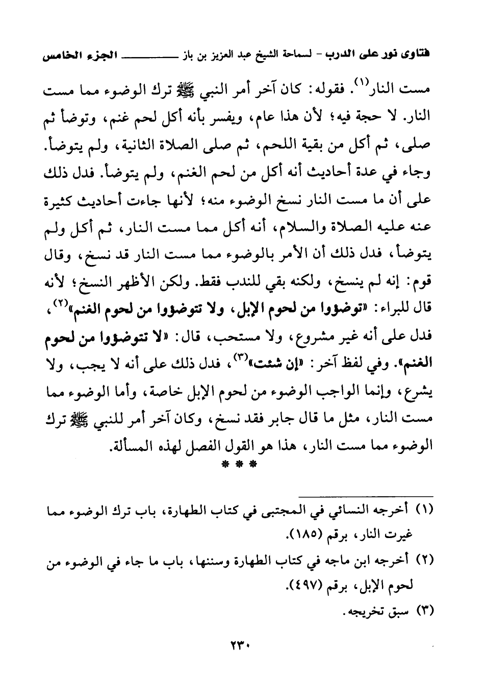 (¬2) أخرجه ابن ماجه في كتاب الطهارة وسننها، باب ما جاء في الوضوء من لحوم الإبل، برقم (497).
