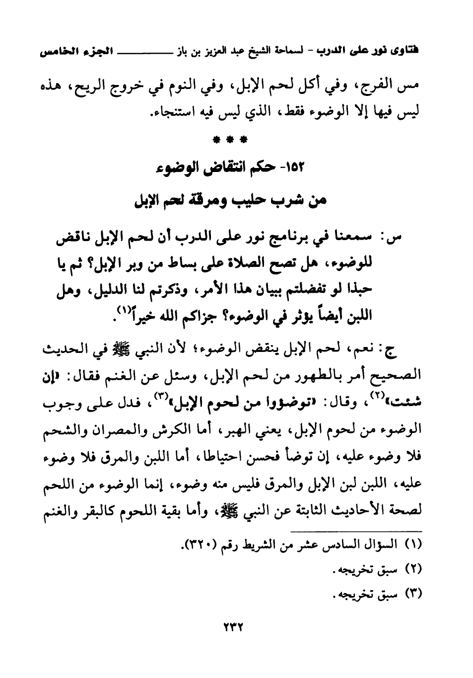 ج: نعم، لحم الإبل ينقض الوضوء؛ لأن النبي صلى الله عليه وسلم في الحديث الصحيح أمر بالطهور من لحم الإبل، وسئل عن الغنم فقال: «إن شئت (¬2)» وقال: «توضؤوا من لحوم الإبل (¬3)» فدل على وجوب الوضوء من لحوم الإبل، يعني الهبر، أما الكرش والمصران والشحم فلا وضوء عليه، إن توضأ فحسن احتياطا، أما اللبن والمرق فلا وضوء عليه، اللبن لبن الإبل والمرق فليس منه وضوء، إنما الوضوء من اللحم لصحة الأحاديث الثابتة عن النبي صلى الله عليه وسلم، وأما بقية اللحوم كالبقر والغنم