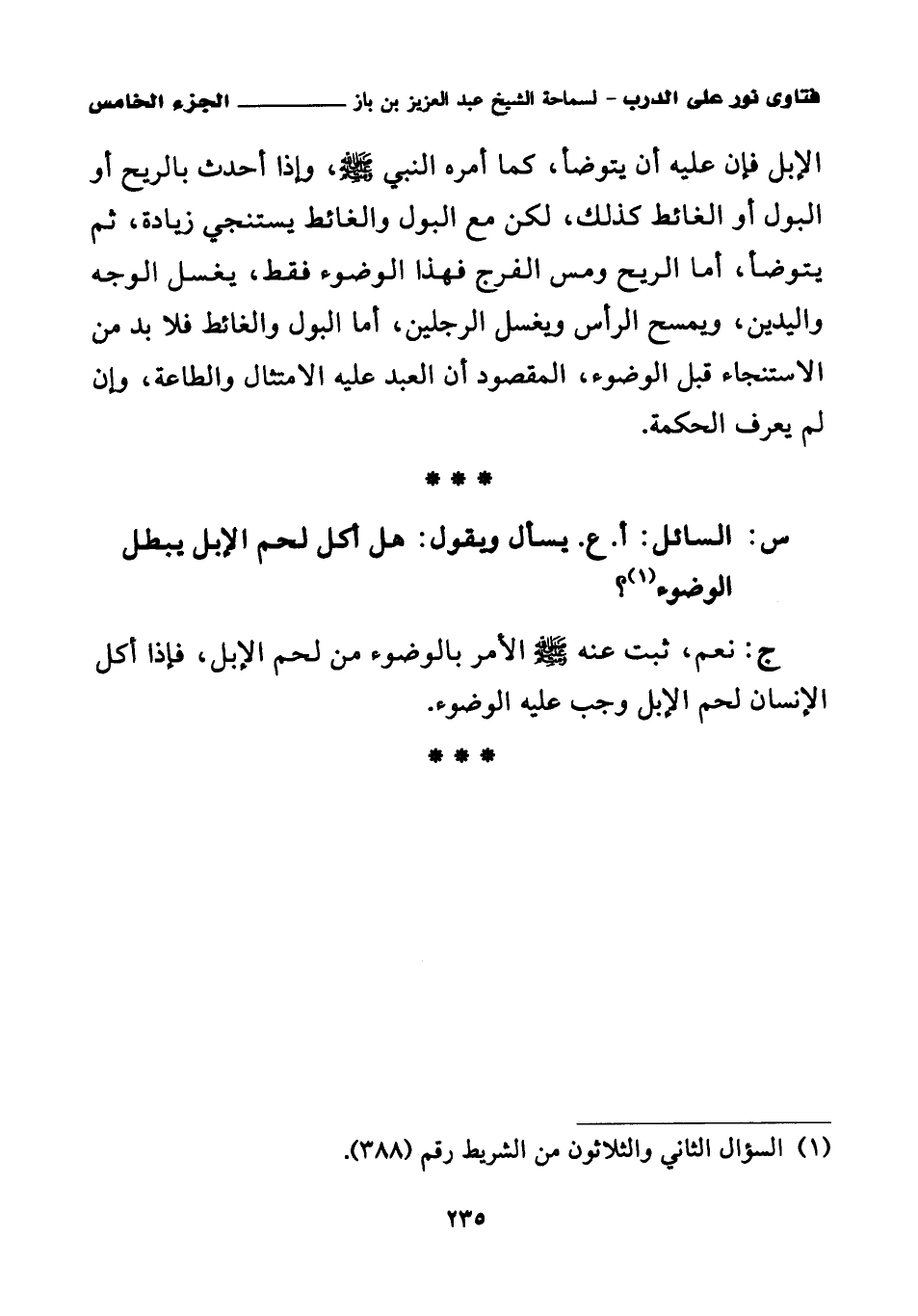 س: السائل: أ. ع. يسأل ويقول: هل أكل لحم الإبل يبطل الوضوء (¬1)؟