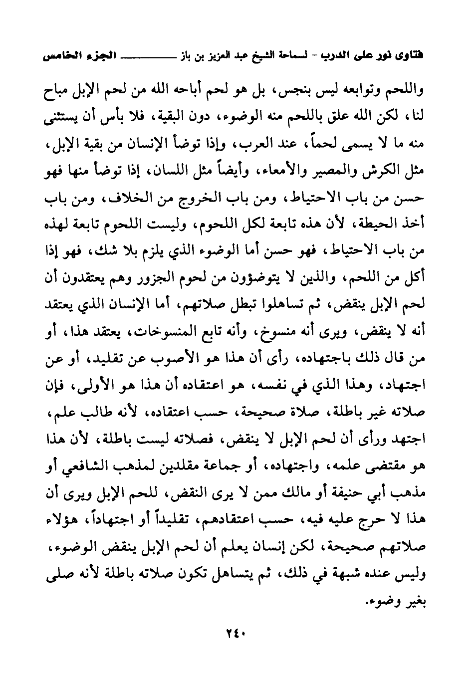 واللحم وتوابعه ليس بنجس، بل هو لحم أباحه الله من لحم الإبل مباح لنا، لكن الله علق باللحم منه الوضوء، دون البقية، فلا بأس أن يستثنى منه ما لا يسمى لحما، عند العرب، وإذا توضأ الإنسان من بقية الإبل، مثل الكرش والمصير والأمعاء، وأيضا مثل اللسان، إذا توضأ منها فهو حسن من باب الاحتياط، ومن باب الخروج من الخلاف، ومن باب أخذ الحيطة، لأن هذه تابعة لكل اللحوم، وليست اللحوم تابعة لهذه من باب الاحتياط، فهو حسن أما الوضوء الذي يلزم بلا شك، فهو إذا أكل من اللحم، والذين لا يتوضؤون من لحوم الجزور وهم يعتقدون أن لحم الإبل ينقض، ثم تساهلوا تبطل صلاتهم، أما الإنسان الذي يعتقد أنه لا ينقض، ويرى أنه منسوخ، وأنه تابع المنسوخات، يعتقد هذا، أو من قال ذلك باجتهاده، رأى أن هذا هو الأصوب عن تقليد، أو عن اجتهاد، وهذا الذي في نفسه، هو اعتقاده أن هذا هو الأولى، فإن صلاته غير باطلة، صلاة صحيحة، حسب اعتقاده، لأنه طالب علم، اجتهد ورأى أن لحم الإبل لا ينقض، فصلاته ليست باطلة، لأن هذا هو مقتضى علمه، واجتهاده، أو جماعة مقلدين لمذهب الشافعي أو مذهب أبي حنيفة أو مالك ممن لا يرى النقض، للحم الإبل ويرى أن هذا لا حرج عليه فيه، حسب اعتقادهم، تقليدا أو اجتهادا، هؤلاء صلاتهم صحيحة، لكن إنسان يعلم أن لحم الإبل ينقض الوضوء، وليس عنده شبهة في ذلك، ثم يتساهل تكون صلاته باطلة لأنه صلى بغير وضوء.