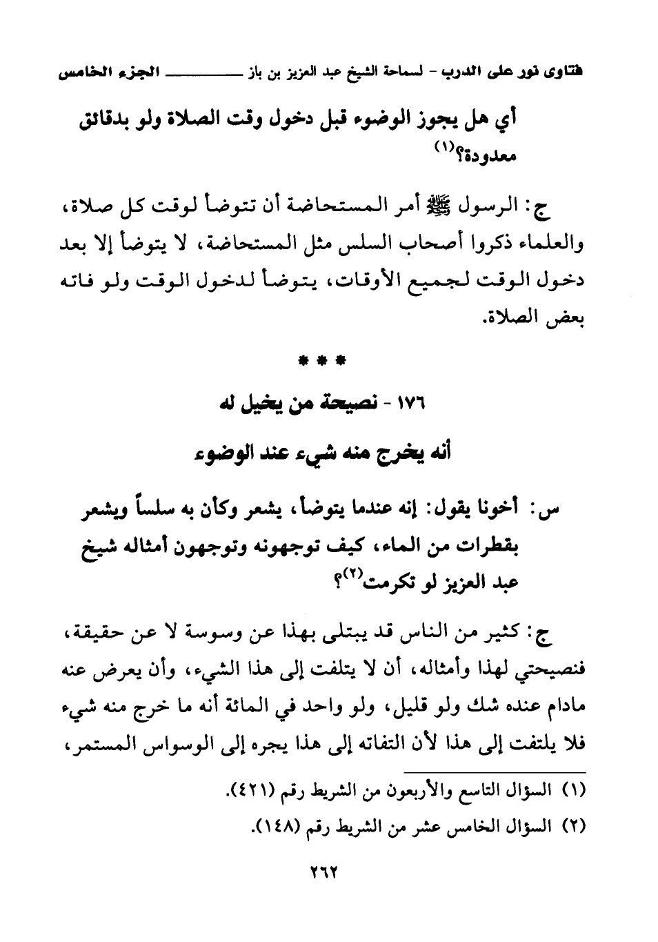 س: أخونا يقول: إنه عندما يتوضأ، يشعر وكأن به سلسا ويشعر بقطرات من الماء، كيف توجهونه وتوجهون أمثاله شيخ عبد العزيز لو تكرمت (¬1)؟