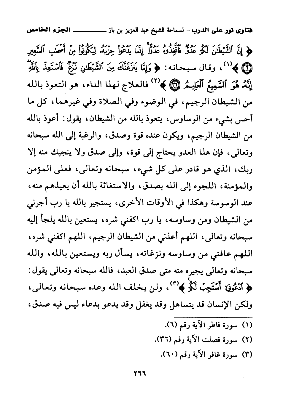{إِنَّ الشَّيْطَانَ لَكُمْ عَدُوٌّ فَاتَّخِذُوهُ عَدُوًّا إِنَّمَا يَدْعُو حِزْبَهُ لِيَكُونُوا مِنْ أَصْحَابِ السَّعِيرِ} (¬1)، وقال سبحانه: {وَإِمَّا يَنْزَغَنَّكَ مِنَ الشَّيْطَانِ نَزْغٌ فَاسْتَعِذْ بِاللَّهِ إِنَّهُ هُوَ السَّمِيعُ الْعَلِيمُ} (¬2) فالعلاج لهذا الداء، هو التعوذ بالله من الشيطان الرجيم، في الوضوء وفي الصلاة وفي غيرهما، كل ما أحس بشيء من الوساوس، يتعوذ بالله من الشيطان، يقول: أعوذ بالله من الشيطان الرجيم، ويكون عنده قوة وصدق، والرغبة إلى الله سبحانه وتعالى، فإن هذا العدو يحتاج إلى قوة، وإلى صدق ولا ينجيك منه إلا ربك، الذي هو قادر على كل شيء، سبحانه وتعالى، فعلى المؤمن والمؤمنة، اللجوء إلى الله بصدق، والاستغاثة بالله أن يعيذهم منه، عند الوسوسة وهكذا في الأوقات الأخرى، يستجير بالله يا رب أجرني من الشيطان ومن وساوسه، يا رب اكفني شره، يستعين بالله يلجأ إليه سبحانه وتعالى، اللهم أعذني من الشيطان الرجيم، اللهم اكفني شره، اللهم عافني من وساوسه ونزغاته، يسأل ربه ويستعين بالله، والله سبحانه وتعالى يجيره منه متى صدق العبد، فالله سبحانه وتعالى يقول: ادعوني استجب لكم، ولن يخلف الله وعده سبحانه وتعالى، ولكن الإنسان قد يتساهل وقد يغفل وقد يدعو بدعاء ليس فيه صدق،
