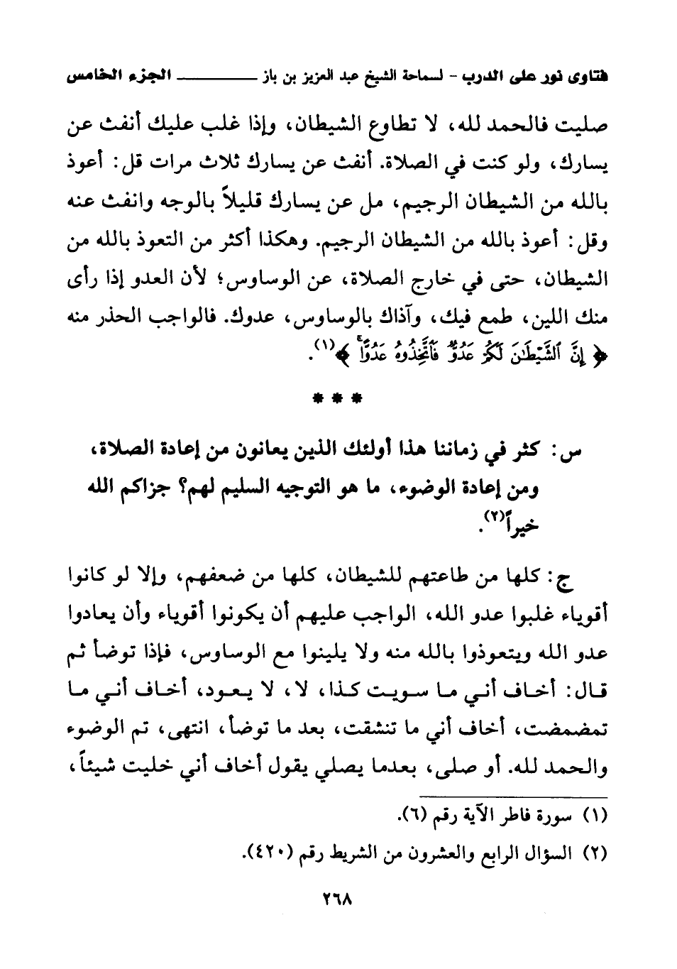 ج: كلها من طاعتهم للشيطان، كلها من ضعفهم، وإلا لو كانوا أقوياء غلبوا عدو الله، الواجب عليهم أن يكونوا أقوياء، وأن يعادوا عدو الله ويتعوذوا بالله منه ولا يلينوا مع الوساوس، فإذا توضأ ثم قال: أخاف أني ما سويت كذا، لا، لا يعود، أخاف أني ما تمضمضت، أخاف أني ما تنشقت، بعد ما توضأ، انتهى، تم الوضوء والحمد لله.