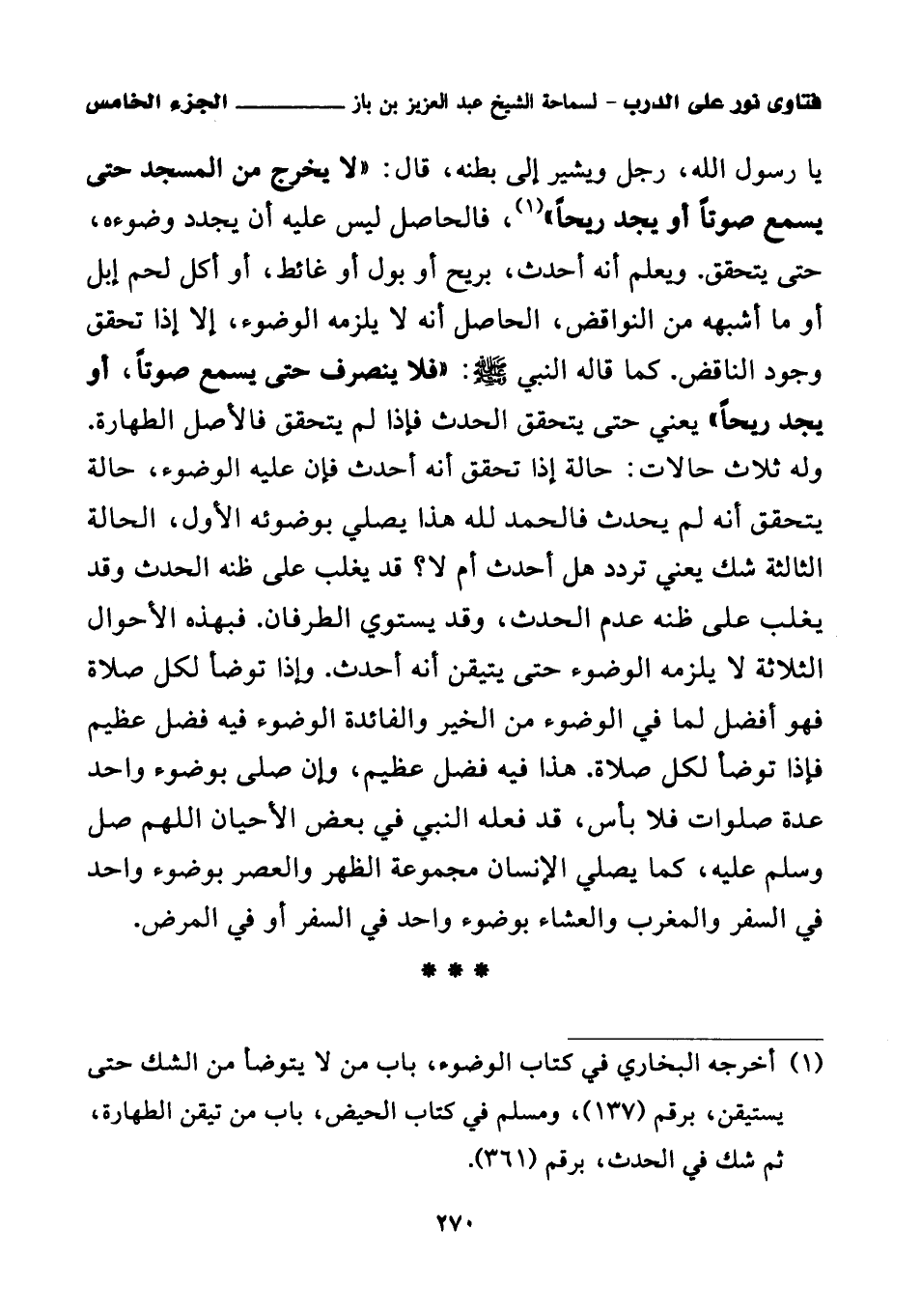 يا رسول الله، رجل ويشير إلى بطنه، قال: «لا يخرج من المسجد حتى يسمع صوتا أو يجد ريحا (¬1)» فالحاصل ليس عليه أن يجدد وضوءه، حتى يتحقق. ويعلم أنه أحدث، بريح أو بول أو غائط، أو أكل لحم إبل أو ما أشبهه من النواقض، الحاصل أنه لا يلزمه الوضوء، إلا إذا تحقق وجود الناقض.