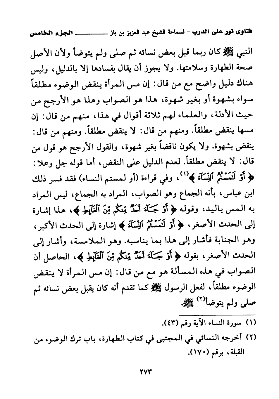 (¬5) أخرجه النسائي في المجتبى في كتاب الطهارة، باب ترك الوضوء من القبلة، برقم (170).
