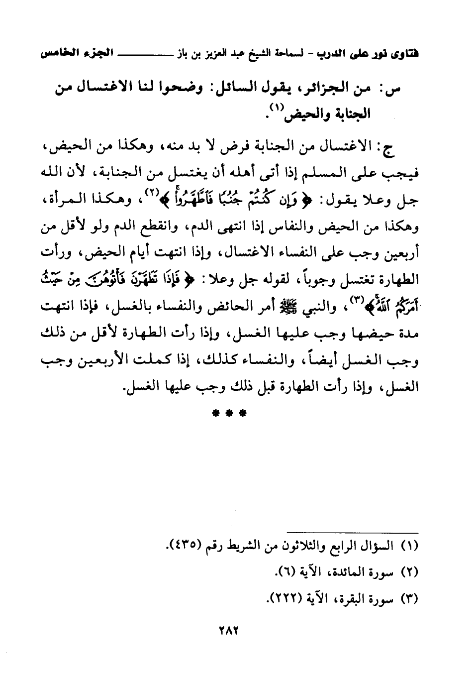 ج: الاغتسال من الجنابة فرض لا بد منه، وهكذا من الحيض، فيجب على المسلم إذا أتى أهله أن يغتسل من الجنابة، لأن الله جل وعلا يقول: {وَإِنْ كُنْتُمْ جُنُبًا فَاطَّهَّرُوا} (¬2)، وهكذا المرأة، وهكذا من الحيض والنفاس إذا انتهى الدم، وانقطع الدم ولو لأقل من أربعين وجب على النفساء والاغتسال، وإذا انتهت أيام الحيض، ورأت الطهارة تغتسل وجوبا، لقوله جل وعلا.