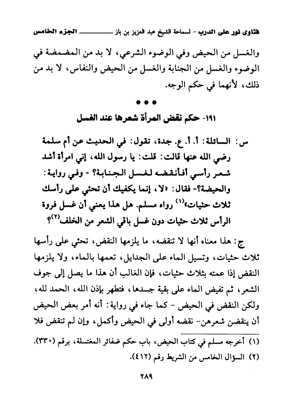 س: السائلة: أ. أ. ع. جدة، تقول: في الحديث عن أم سلمة رضي الله عنها قالت: قلت: «يا رسول الله، أني امرأة أشد شعر رأسي أفأنقضه لغسل الجنابة؟ - وفي رواية: والحيضة؟ - فقال: لا، إنما يكفيك أن تحثي على رأسك ثلاث حثيات (¬1)» رواه مسلم. هل هذا يعني أن أغسل فروة الرأس ثلاث حثيات دون غسل باقي الشعر من الخلف (¬2)؟