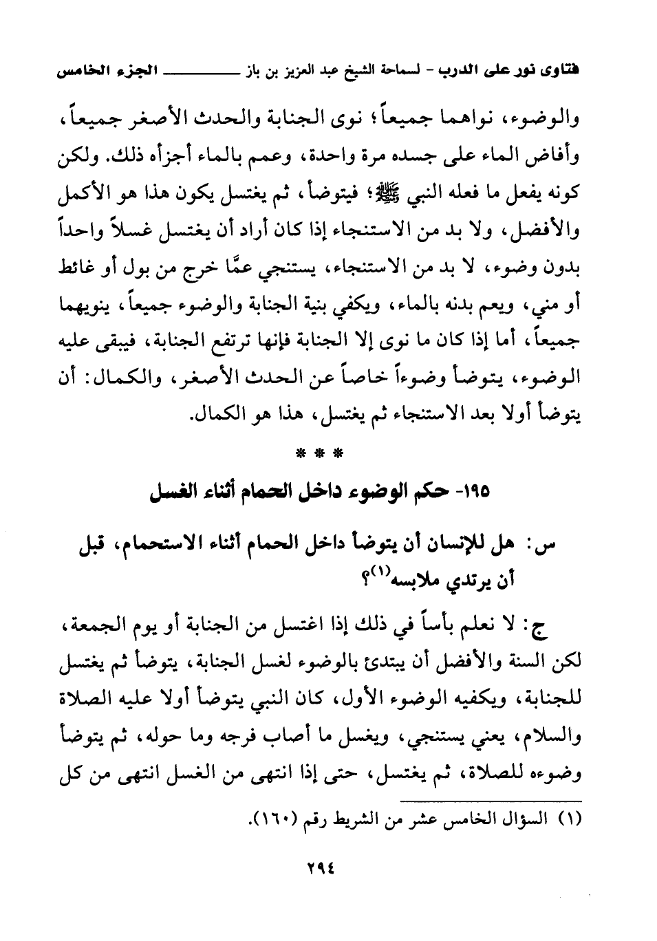 195 - حكم الوضوء داخل الحمام أثناء الغسل