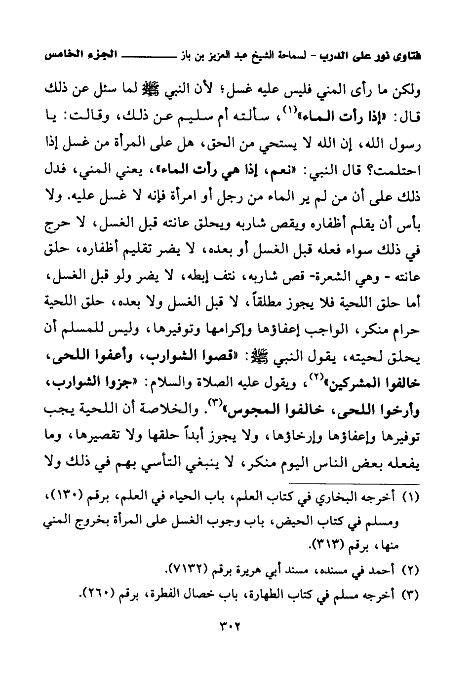 ولكن ما رأى المني فليس عليه غسل؛ لأن النبي صلى الله عليه وسلم لما سئل عن ذلك قال: «إذا رأت الماء (¬1)» سألته أم سليم عن ذلك، وقالت: «يا رسول الله، إن الله لا يستحي من الحق، هل على المرأة من غسل إذا احتلمت؟ قال النبي: نعم، إذا هي رأت الماء (¬2)»، يعني المني، فدل ذلك على أن من لم ير الماء من رجل أو امرأة فإنه لا غسل عليه، ولا بأس أن يقلم أظفاره ويقص شاربه ويحلق عانته قبل الغسل، لا حرج في ذلك سواء فعله قبل الغسل أو بعده، لا يضر تقليم أظفاره، حلق عانته – وهي الشعرة – قص شاربه، نتف إبطه، لا يضر ولو قبل الغسل، أما حلق اللحية فلا يجوز مطلقا، لا قبل الغسل ولا بعده، حلق اللحية حرام منكر، الواجب إعفاؤها وإكرامها وتوفيرها، وليس للمسلم أن يحلق لحيته، يقول النبي صلى الله عليه وسلم: «قصوا الشوارب، وأعفوا اللحى، خالفوا المشركين (¬3)» ويقول عليه الصلاة والسلام: «جزوا الشوارب، وأرخوا اللحى، خالفوا المجوس (¬4)»