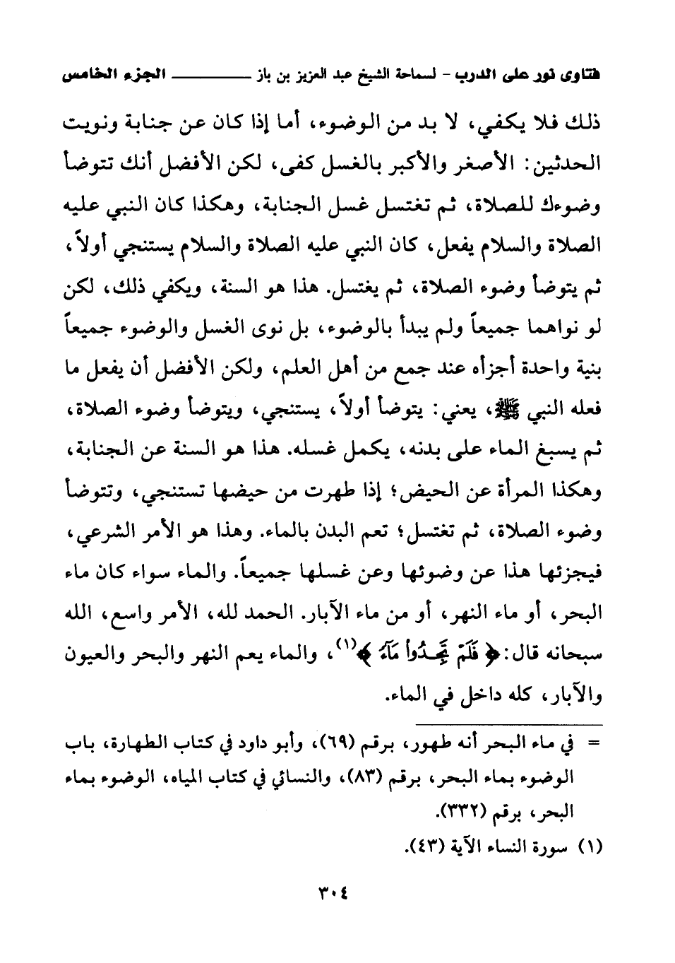 ذلك فلا يكفي، لا بد من الوضوء، أما إذا كان عن جنابة ونويت الحدثين: الأصغر والأكبر بالغسل كفى، لكن الأفضل أنك تتوضأ وضوءك للصلاة، ثم تغتسل غسل الجنابة، وهكذا كان النبي عليه الصلاة والسلام يفعل، كان النبي عليه الصلاة والسلام يستنجي أولا، ثم يتوضأ وضوء الصلاة، ثم يغتسل، هذا هو السنة، ويكفي ذلك، لكن لو نواهما جميعا ولم يبدأ بالوضوء، بل نوى الغسل والوضوء جميعا بنية واحدة أجزأه عند جمع من أهل العلم، ولكن الأفضل أن يفعل ما فعله النبي صلى الله عليه وسلم، يعني: يتوضأ أولا، يستنجي، ويتوضأ وضوء الصلاة، ثم يسبغ الماء على بدنه، يكمل غسله، هذا هو السنة عن الجنابة، وهكذا المرأة عن الحيض؛ إذا طهرت من حيضها تستنجي، وتتوضأ وضوء الصلاة، ثم تغتسل؛ تعم البدن بالماء، وهذا هو الأمر الشرعي، فيجزئها هذا عن وضوئها وعن غسلها جميعا، والماء سواء كان ماء البحر، أو ماء النهر، أو من ماء الآبار، الحمد لله، الأمر واسع، الله سبحانه قال: {فَلَمْ تَجِدُوا مَاءً} (¬1)، والماء يعم النهر والبحر والعيون والآبار، كله داخل في الماء.