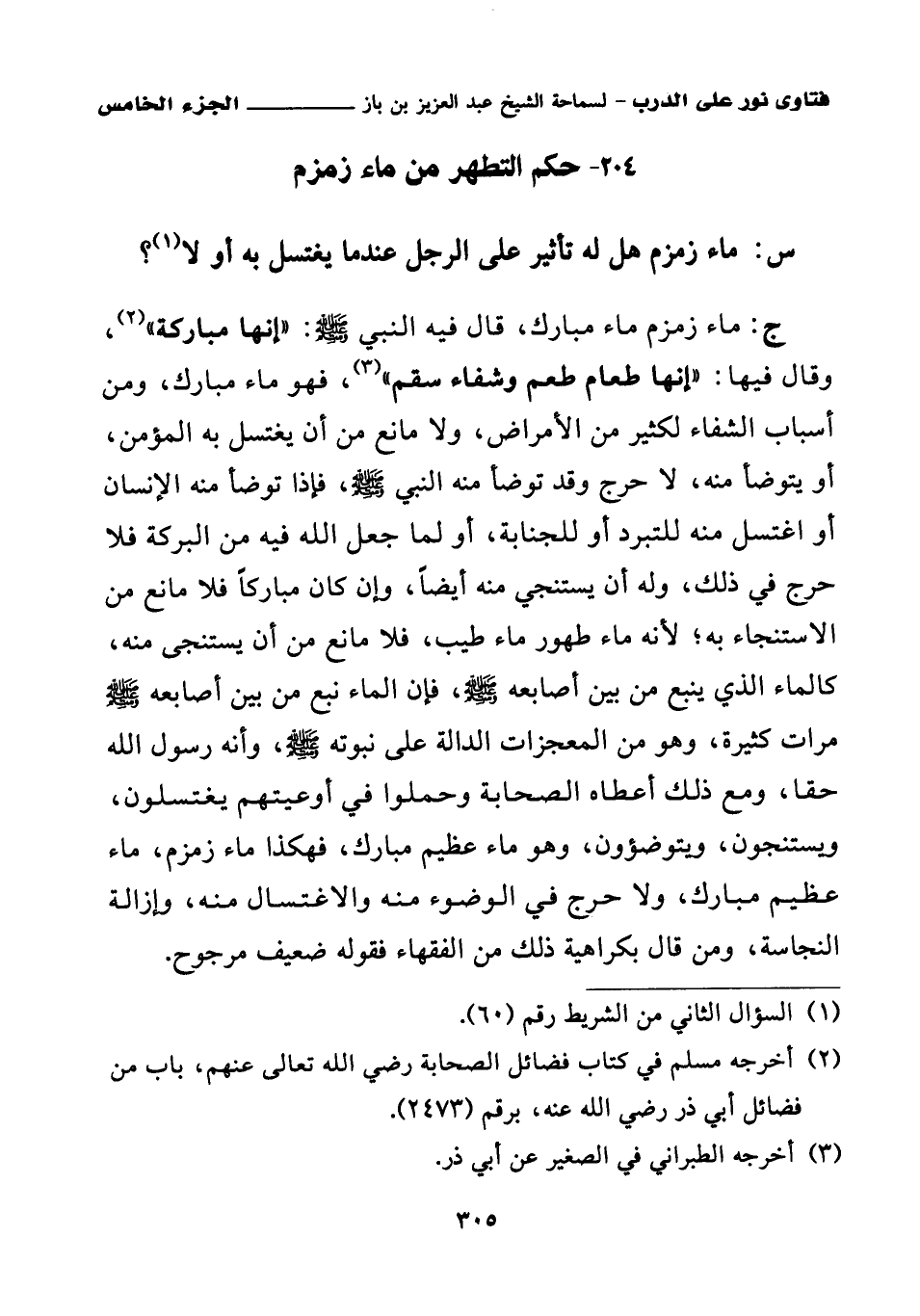 ج: ماء زمزم ماء مبارك، قال فيه النبي صلى الله عليه وسلم: «إنها مباركة (¬2)» وقال فيها: «إنها طعام طعم وشفاء سقم (¬3)» فهو ماء مبارك، ومن أسباب الشفاء لكثير من الأمراض، ولا مانع من أن يغتسل به المؤمن، أو يتوضأ منه، لا حرج وقد توضأ منه النبي صلى الله عليه وسلم، فإذا توضأ منه الإنسان أو اغتسل منه للتبرد أو للجنابة، أو لما جعل الله فيه من البركة فلا حرج في ذلك، وله أن يستنجي منه أيضا، وإن كان مباركا فلا مانع من الاستنجاء به؛ لأنه ماء طهور ماء طيب، فلا مانع من أن يستنجي منه، كالماء الذي ينبع من بين أصابعه صلى الله عليه وسلم، فإن الماء نبع من بين أصابعه صلى الله عليه وسلم مرات كثيرة، وهو من المعجزات الدالة على نبوته صلى الله عليه وسلم، وأنه رسول الله حقا، ومع ذلك أعطاه الصحابة وحملوا في أوعيتهم يغتسلون، ويستنجون، ويتوضؤون، وهو ماء عظيم مبارك، فهكذا ماء زمزم، ماء عظيم مبارك، ولا حرج في الوضوء منه والاغتسال منه، وإزالة النجاسة، ومن قال بكراهية ذلك من الفقهاء فقوله ضعيف مرجوح.