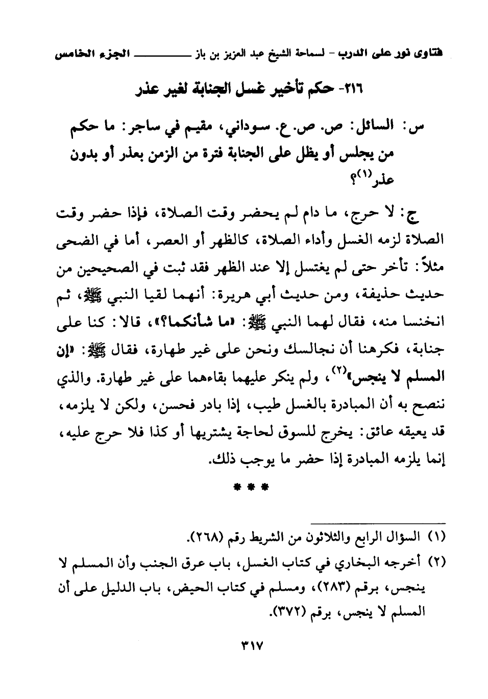ج: لا حرج، ما دام لم يحضر وقت الصلاة، فإذا حضر وقت الصلاة لزمه الغسل وأداء الصلاة، كالظهر أو العصر، أما في الضحى مثلا: تأخر حتى لم يغتسل إلا عند الظهر فقد ثبت في الصحيحين من حديث حذيفة، ومن حديث أبي هريرة: «أنهما لقيا النبي صلى الله عليه وسلم، ثم انخنسا منه، فقال لهما النبي صلى الله عليه وسلم: ما شأنكما؟، قالا: كنا على جنابة، فكرهنا أن نجالسك ونحن على غير طهارة، فقال صلى الله عليه وسلم: إن المسلم لا ينجس (¬2)» ولم ينكر عليهما بقاءهما على غير طهارة.