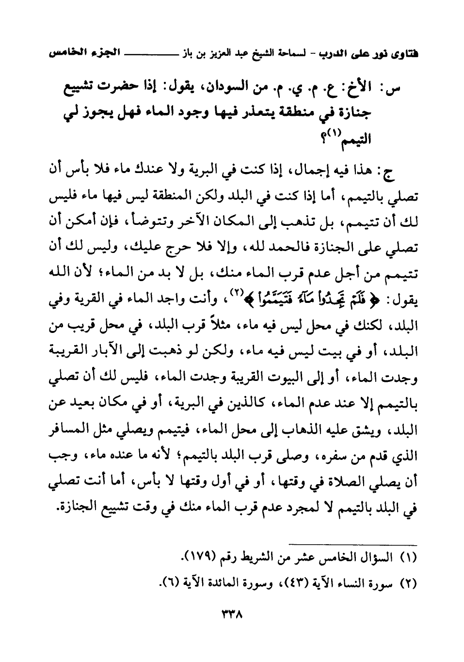 ج: هذا فيه إجمال، إذا كنت في البرية ولا عندك ماء فلا بأس أن تصلي بالتيمم، أما إذا كنت في البلد ولكن المنطقة ليس فيها ماء فليس لك أن تتيمم، بل تذهب إلى المكان الآخر وتتوضأ، فإن أمكن أن تصلي على الجنازة فالحمد لله، وإلا فلا حرج عليك، وليس لك أن تتيمم من أجل عدم قرب الماء منك، بل لا بد من الماء؛ لأن الله يقول: {فَلَمْ تَجِدُوا مَاءً فَتَيَمَّمُوا} (¬2)، وأنت واجد الماء في القرية وفي البلد، لكنك في محل ليس فيه ماء، مثلا قرب البلد، في محل قريب من البلد، أو في بيت ليس فيه ماء، ولكن لو ذهبت إلى الآبار القريبة وجدت الماء، أو إلى البيوت القريبة وجدت الماء، فليس لك أن تصلي بالتيمم إلا عند عدم الماء، كالذين في البرية، أو في مكان بعيد عن البلد، ويشق عليه الذهاب إلى محل الماء، فيتيمم ويصلي مثل المسافر الذي قدم من سفره، وصلى قرب البلد بالتيمم؛ لأنه ما عنده ماء، وجب أن يصلي الصلاة في وقتها، أو في أول وقتها لا بأس، أما أنت تصلي في البلد بالتيمم لا لمجرد عدم قرب الماء منك في وقت تشييع الجنازة.