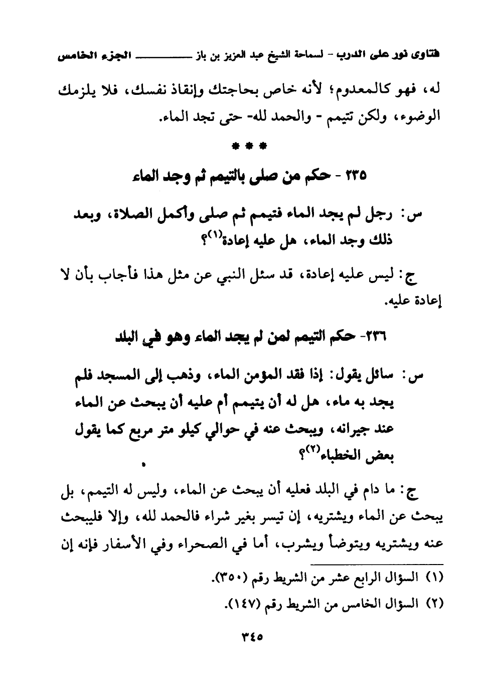236 - حكم التيمم لمن لم يجد الماء وهو في البلد