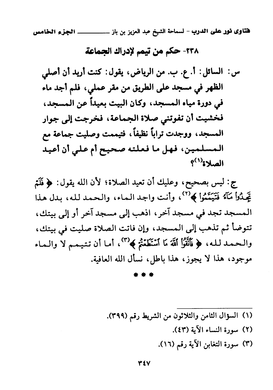 ج: ليس بصحيح، وعليك أن تعيد الصلاة؛ لأن الله يقول: {فَلَمْ تَجِدُوا مَاءً فَتَيَمَّمُوا} (¬2)، وأنت واجد الماء، والحمد لله، بدل هذا المسجد تجد في مسجد آخر، اذهب إلى مسجد آخر أو إلى بيتك تتوضأ ثم تذهب إلى المسجد، وإن فاتت الصلاة صليت في بيتك، والحمد لله، {فَاتَّقُوا اللَّهَ مَا اسْتَطَعْتُمْ} (¬3)، أما أن تتيمم لا والماء موجود، هذا لا يجوز، هذا باطل، نسأل الله العافية.