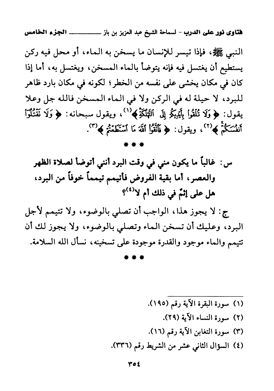 النبي صلى الله عليه وسلم، فإذا تيسر للإنسان ما يسخن به الماء، أو محل فيه ركن يستطيع أن يغتسل فيه فإنه يتوضأ بالماء المسخن، ويغتسل به، أما إذا كان في مكان يخشى على نفسه من الخطر؛ لكونه في مكان بارد ظاهر للبرد، لا حيلة له في الركن ولا في الماء المسخن فالله جل وعلا يقول: {وَلَا تُلْقُوا بِأَيْدِيكُمْ إِلَى التَّهْلُكَةِ} (¬1)، ويقول سبحانه: {وَلَا تَقْتُلُوا أَنْفُسَكُمْ} (¬2)، ويقول: {فَاتَّقُوا اللَّهَ مَا اسْتَطَعْتُمْ} (¬3).