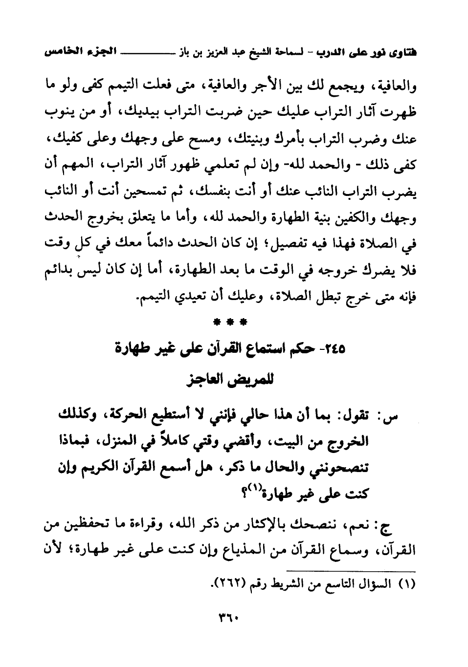 245 - حكم استماع القرآن على غير طهارة للمريض العاجز