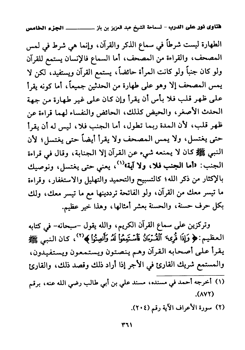 وتركزين على سماع القرآن الكريم، والله يقول – سبحانه – في كتابه العظيم: {وَإِذَا قُرِئَ الْقُرْآنُ فَاسْتَمِعُوا لَهُ وَأَنْصِتُوا} (¬2)، كان النبي صلى الله عليه وسلم يقرأ على أصحابه القرآن وهم ينصتون ويستمعون ويستفيدون، والمستمع شريك القارئ في الأجر إذا أراد ذلك وقصد ذلك، والقارئ